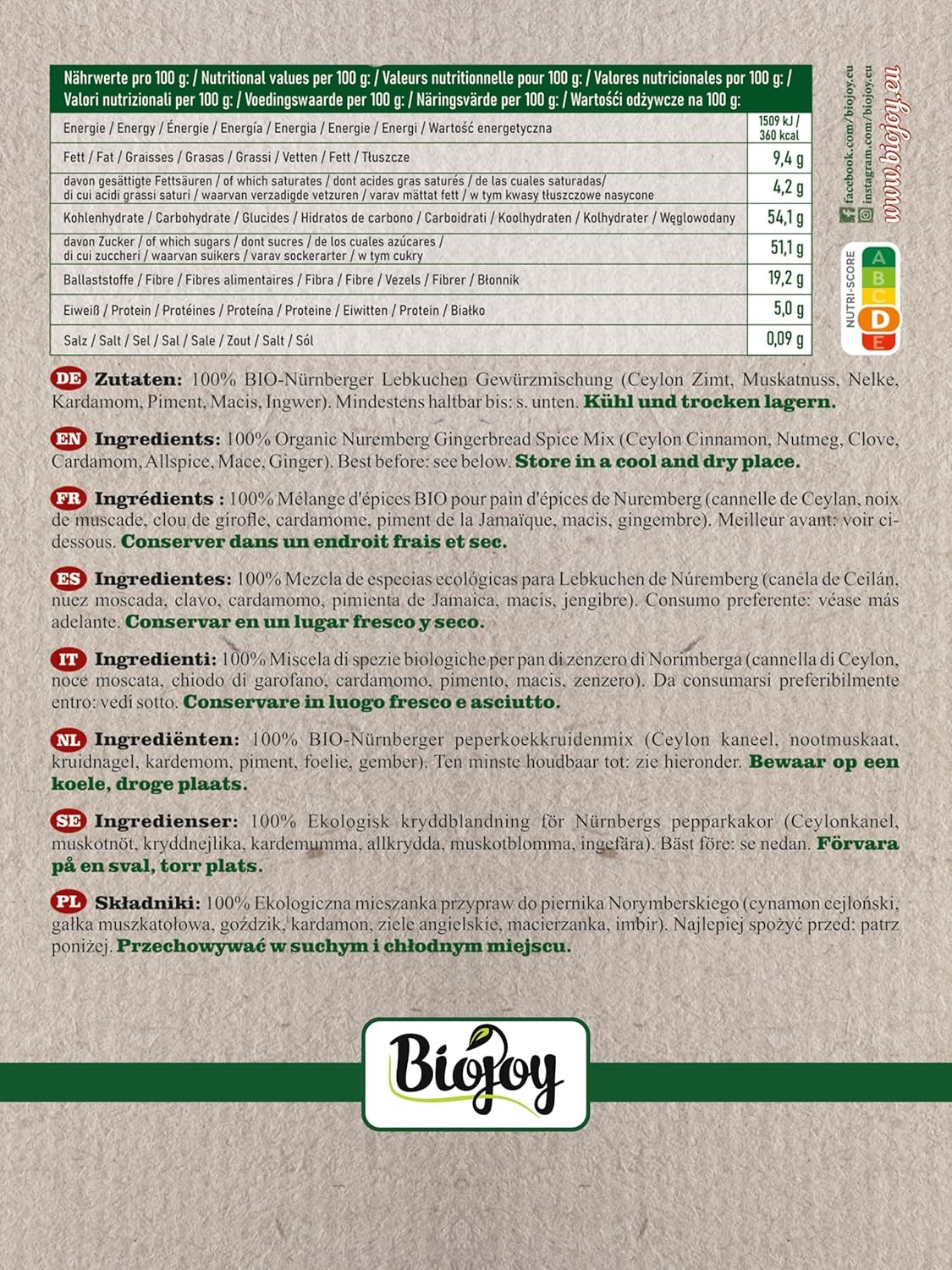 • ➤ SODDISFAZIONE | Per la nostra spezia BIO per pan di zenzero, come per tutti i nostri prodotti naturali, vale la nostra promessa di qualità Biojoy. Vi invitiamo a darci un feedback e a valutarci, così sapremo quanto siete soddisfatti del nostro servizio e della qualità del prodotto.