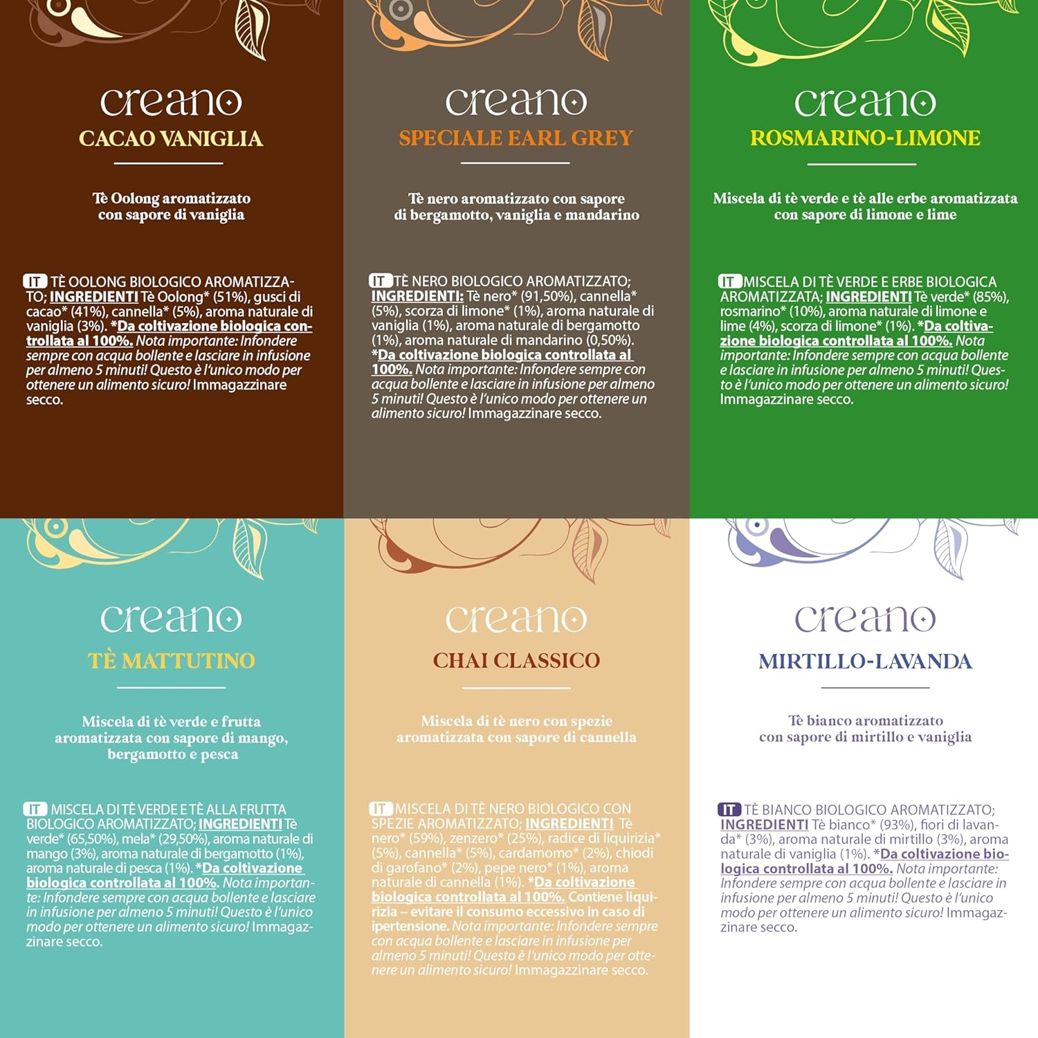 Logo circolare con testo «Creano», circondato da disegni floreali colorati e ispirati alla natura. Due etichette di certificazione verdi visibili nell'angolo in basso a destra