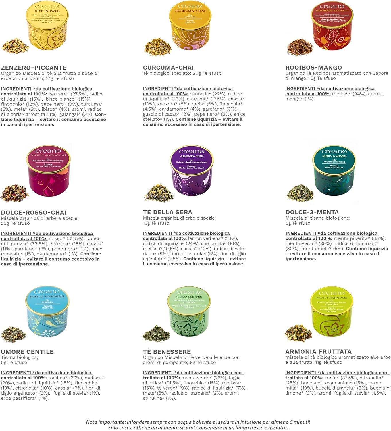 • 🔥 DELICIOSO CALDO O FREDDO – Le tisane Creano sono ideali da gustare sia come bevanda calda rilassante che come infuso rinfrescante freddo.