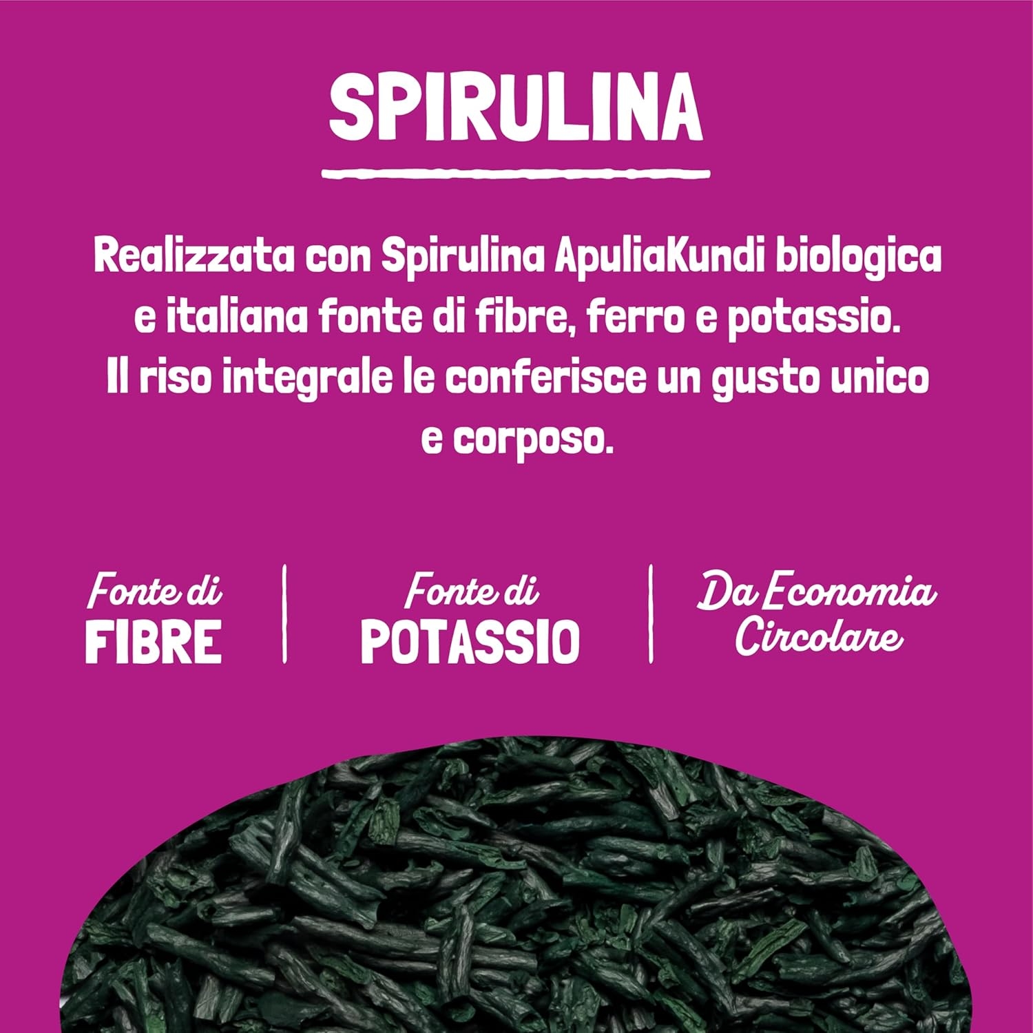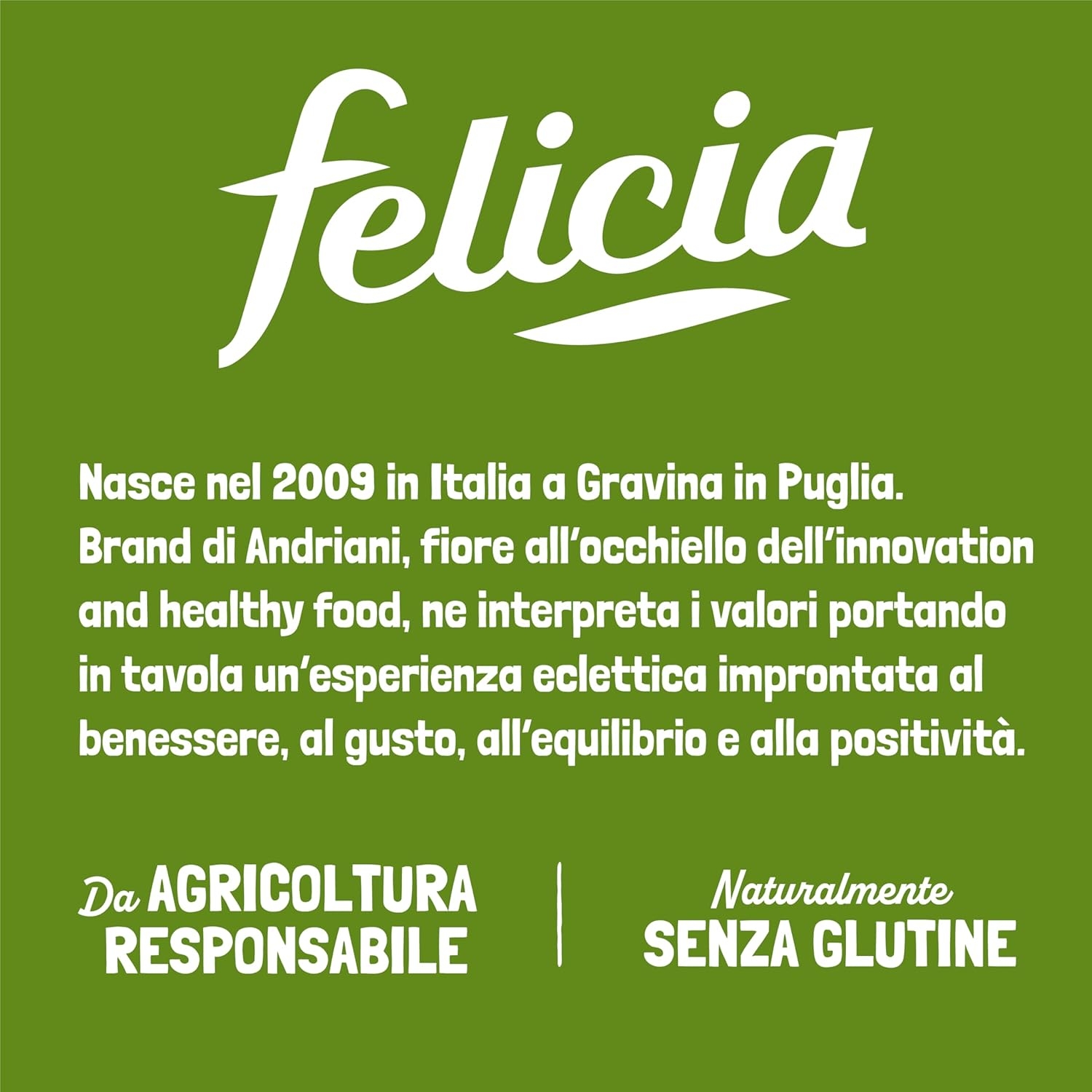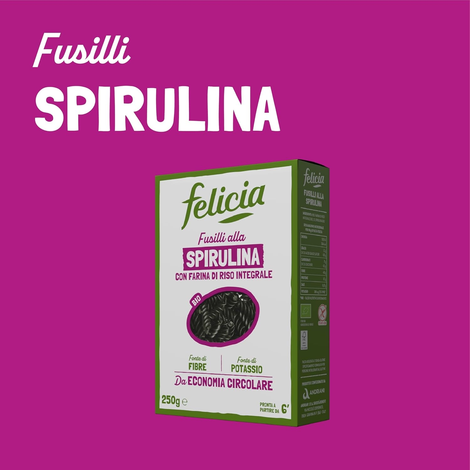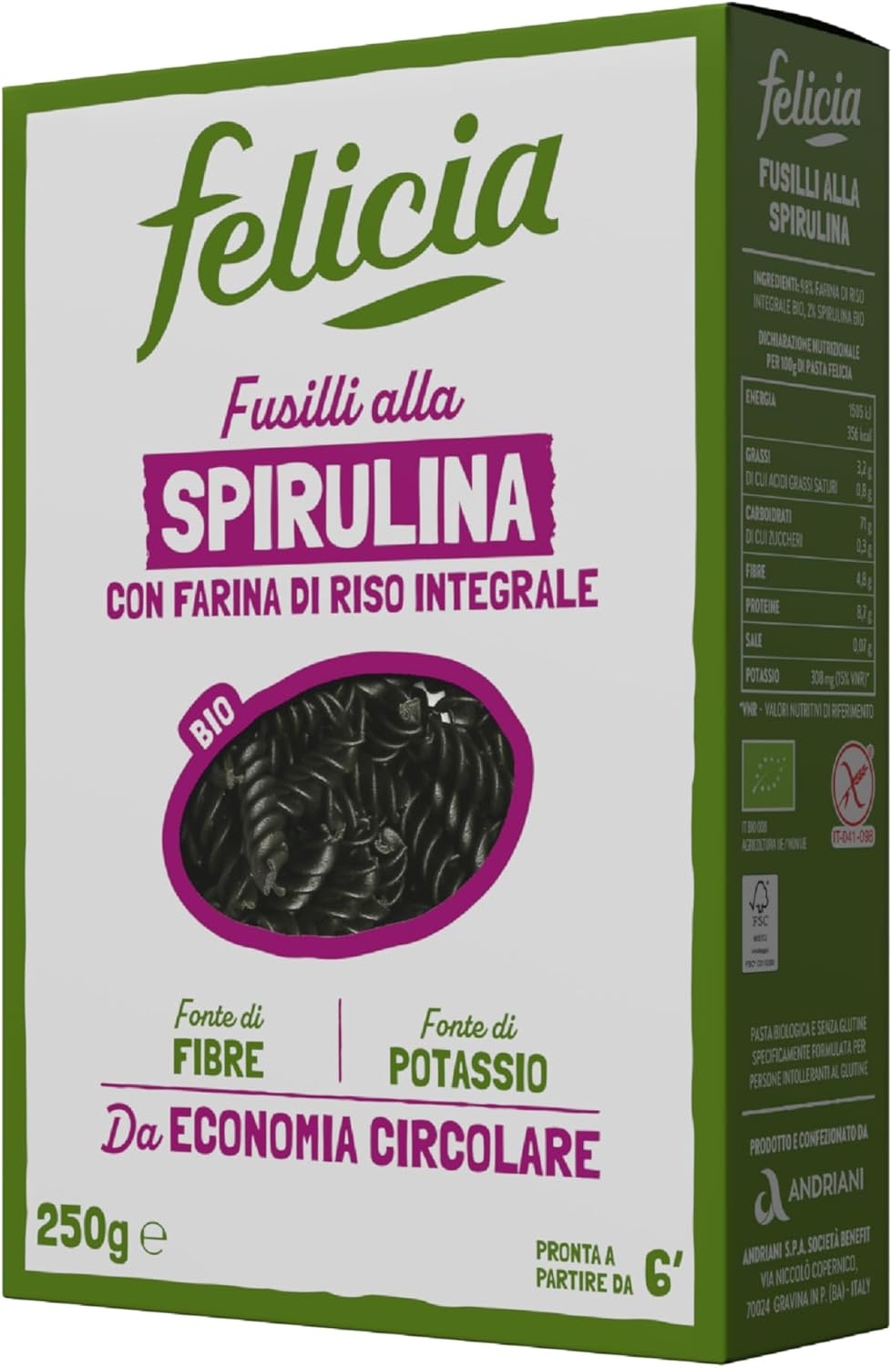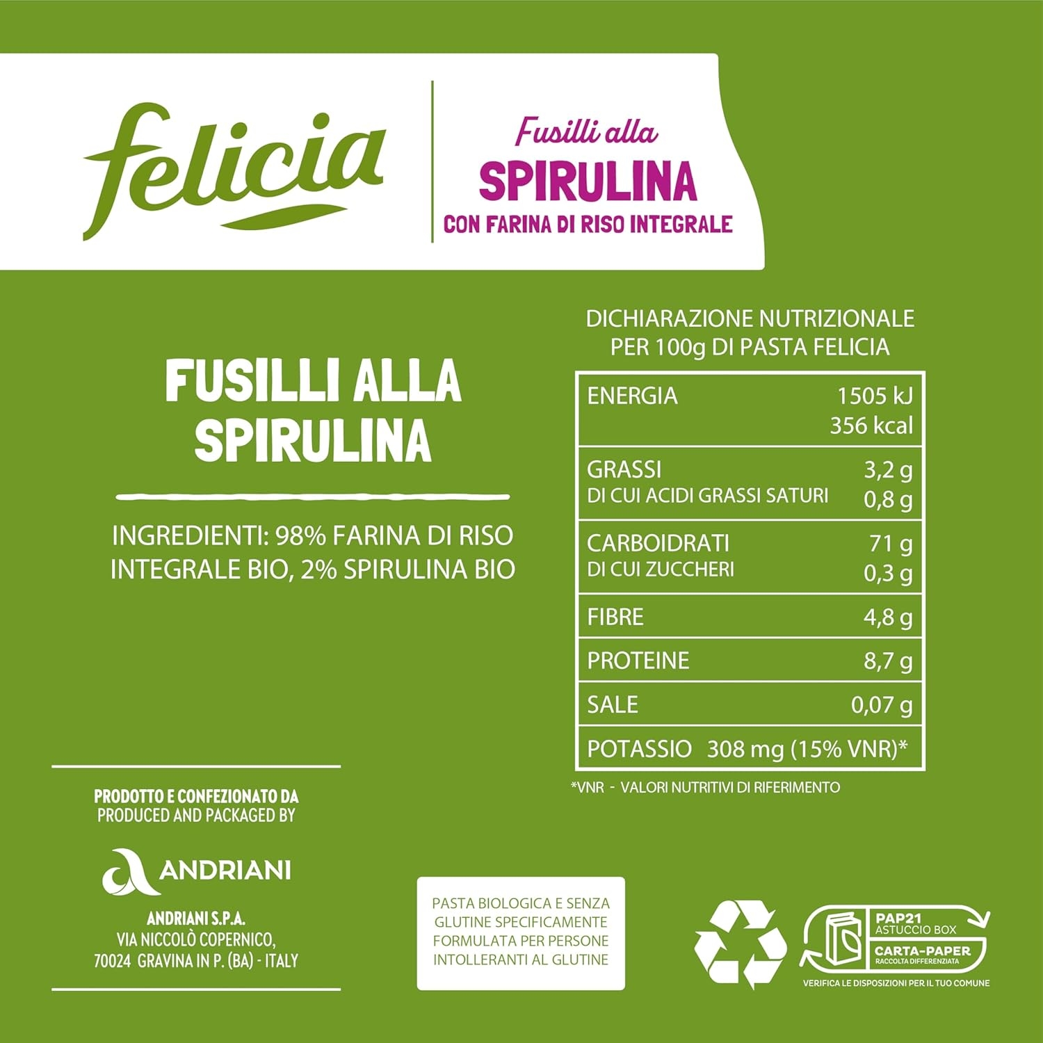 CONTENUTO – A casa riceverai una confezione da 250g di fusilli Felicia alla spirulina, ideali per un pasto salutare e ricco di nutrienti. La pasta alla spirulina di Felicia è una fonte di fibre, di ferro e di potassio ed è naturalmente senza glutine.RISO INTEGRALE – La pasta 100% riso integrale Felicia deriva da agricoltura biologica e ha un solo ingrediente: 100% farina di riso integrale biologico e italiano. Contiene fibre, proteine e nutrienti utili al buon funzionamento dell’organismo.INGREDIENTI – 2% spirulina bio, 98% farina di riso integraleFELICIA – Felicia è un brand di Andriani S.p.A Società Benefit che ha fatto dell’innovazione e della sostenibilità elementi principali della sua crescita. Prodotta nell’unico pastificio italiano allergen free con molino multigrain integrato.SERVIZIO CLIENTI – Vogliamo che il cliente sia soddisfatto dei nostri prodotti al 100%, per questa ragione mettiamo a vostra disposizione il servizio d’assistenza 24 ore su 24, 7 giorni su 7. Non esitare a contattarci!