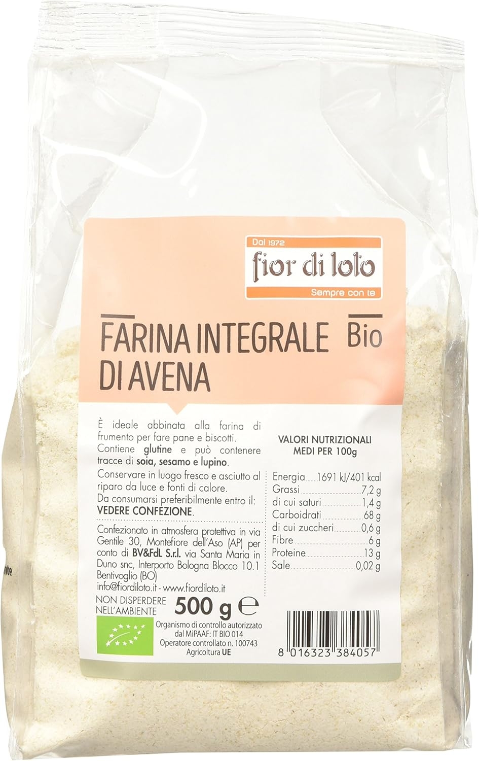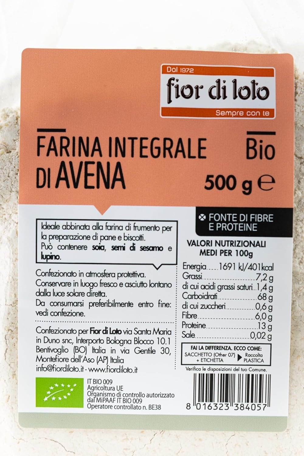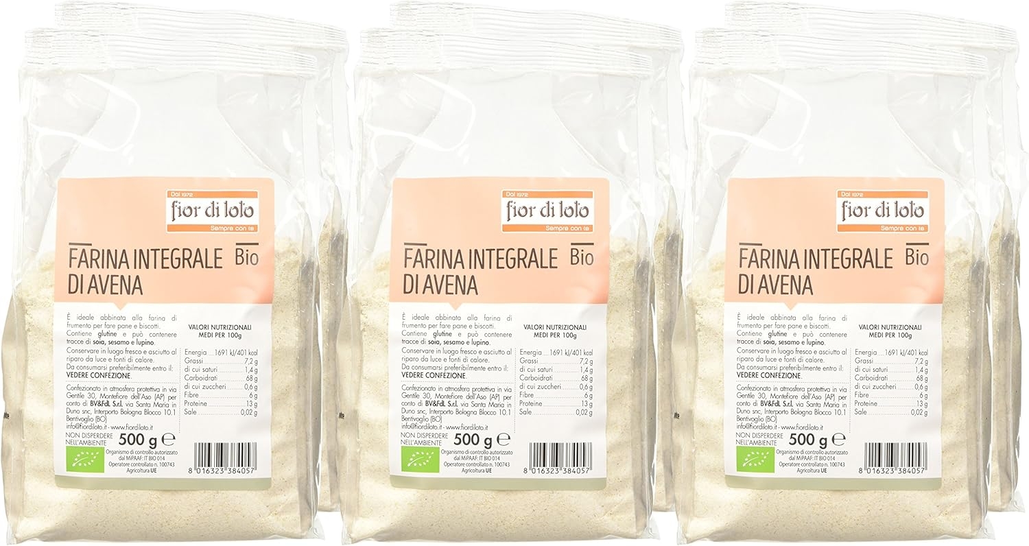 La farina integrale di avena viene prodotta con materia prima coltivata in Italia e serve per la preparazione di piatti dolci o salati.