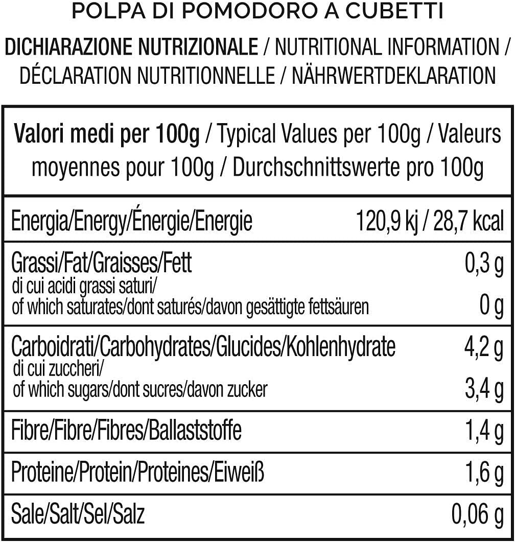 La polpa di pomodoro a cubetti viene prodotta e confezionata in Italia; i pomodori sono coltivati stagionalmente in Italia, terre particolarmente vocate per clima e qualità alla coltivazione dei pomodori.