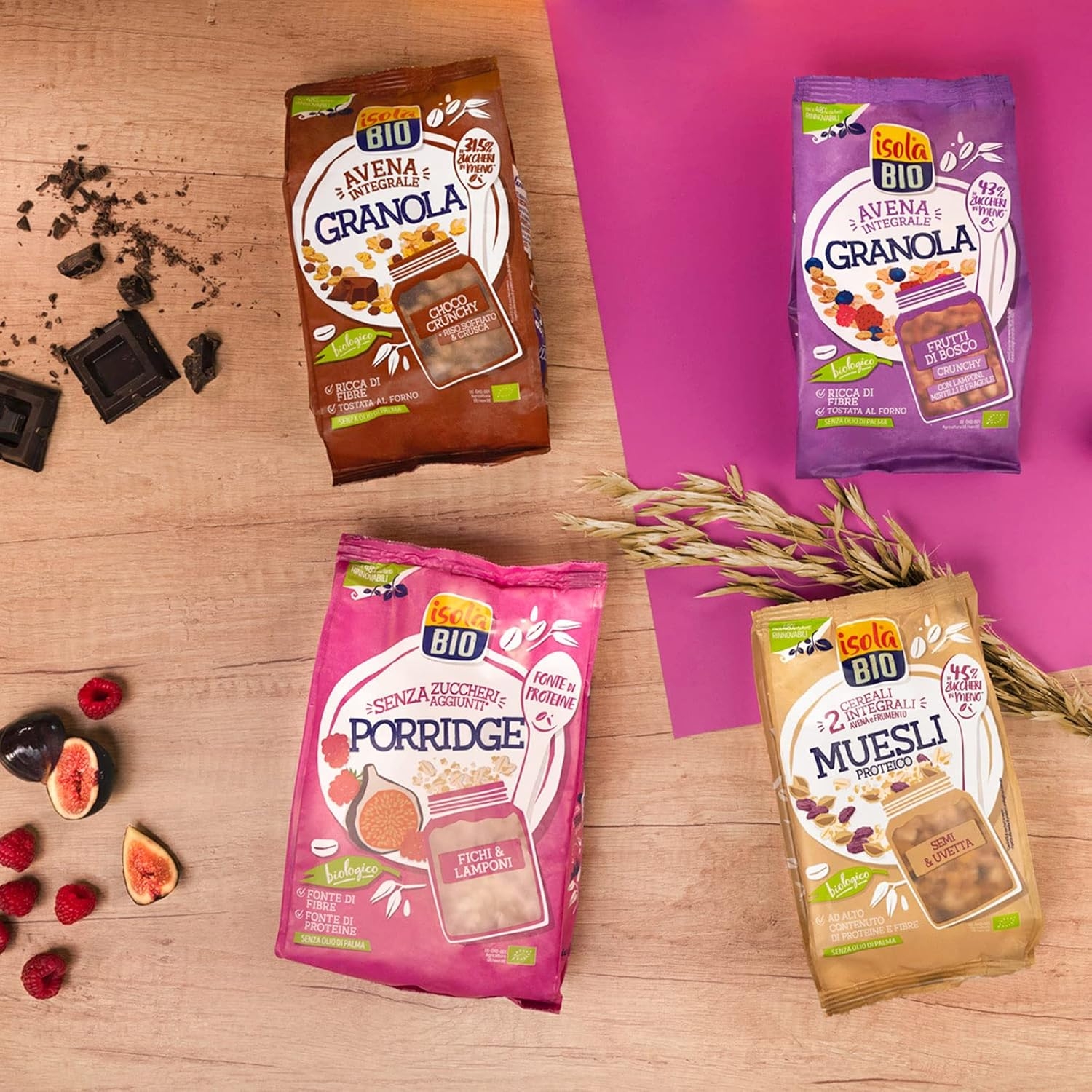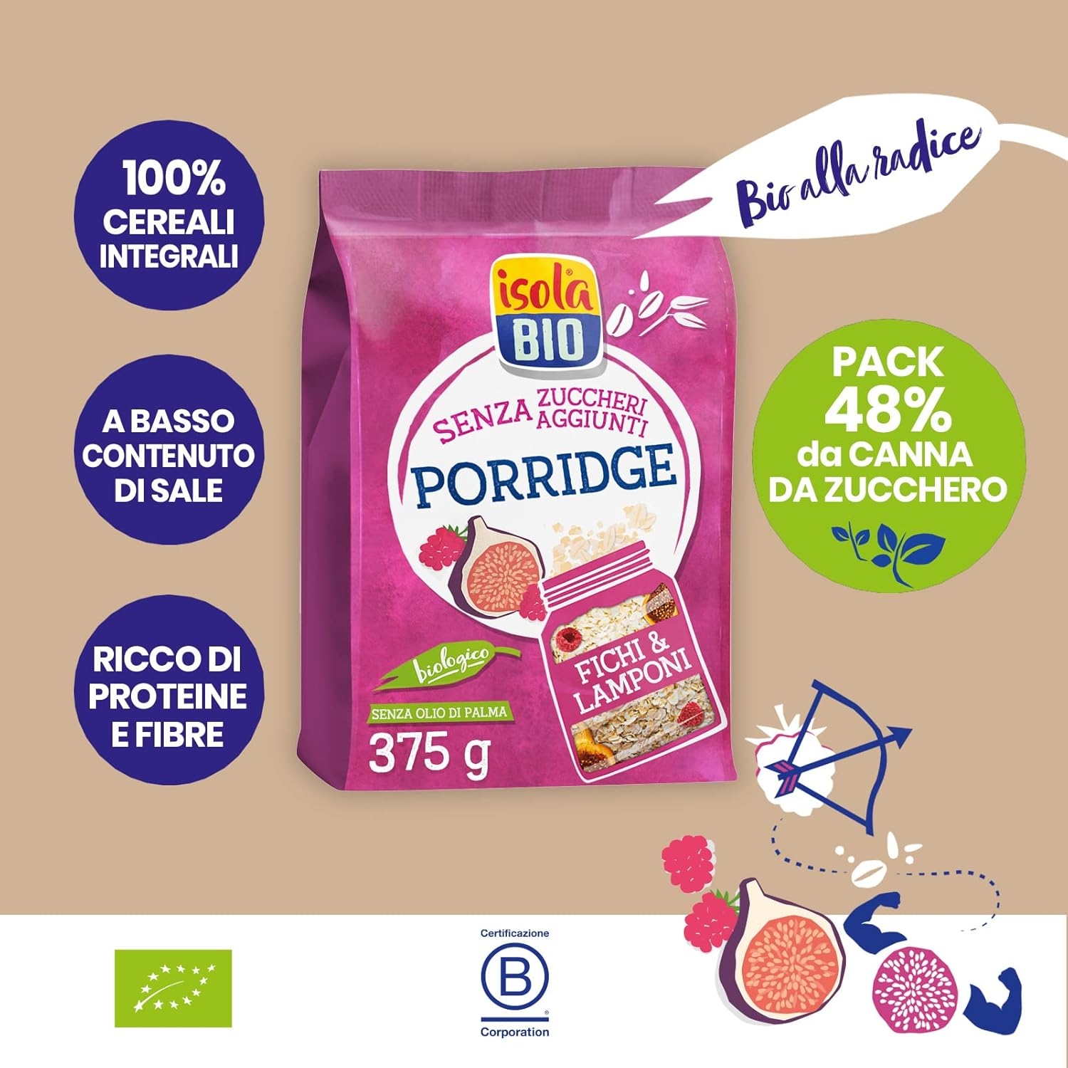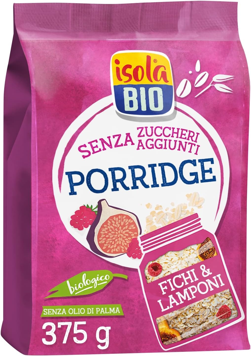 Isola Bio Porridge Biologico Fichi e Lamponi, Senza Zuccheri Aggiunti, Ricco di Fibre e Proteine, 100% Ingredienti Naturali, per Vegani e Vegetariani, 375 gr