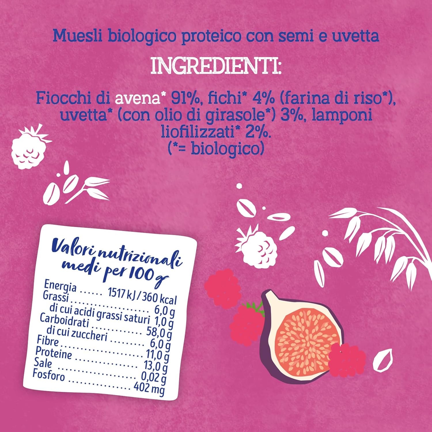 Fiocchi di AVENA 91%, fichi 4% (farina di riso), uvetta (con olio di girasole) 3%, lamponi liofilizzati 2%.