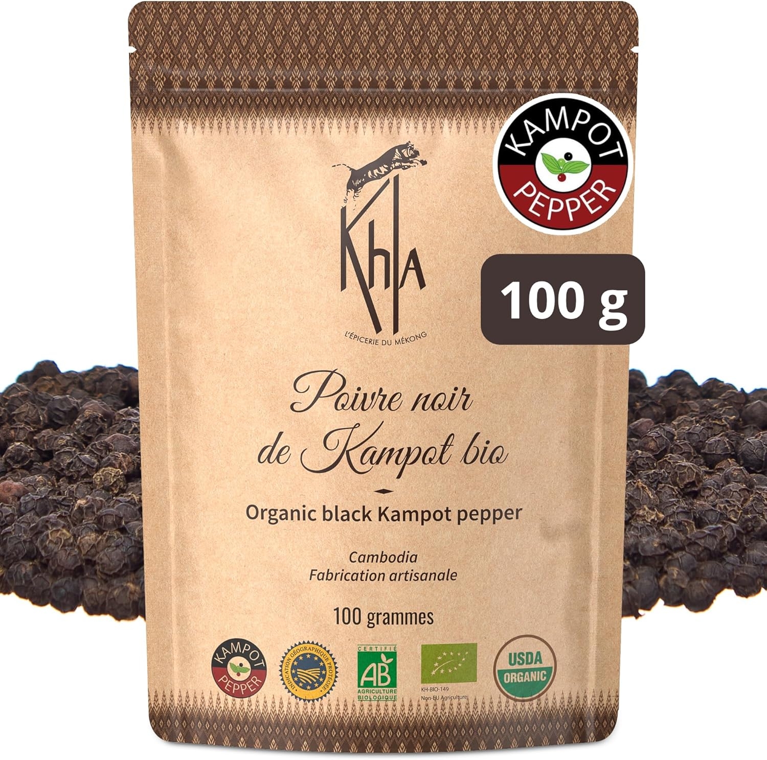 Khla – Pepe Nero di Kampot Certificato Biologico 100g – Pepe di Kampot in Grani Bio – Raro e Delicato – Ingrediente Spezie Cucina – Produzione Limitata – Direttamente dal produttore – Origine Cambogia