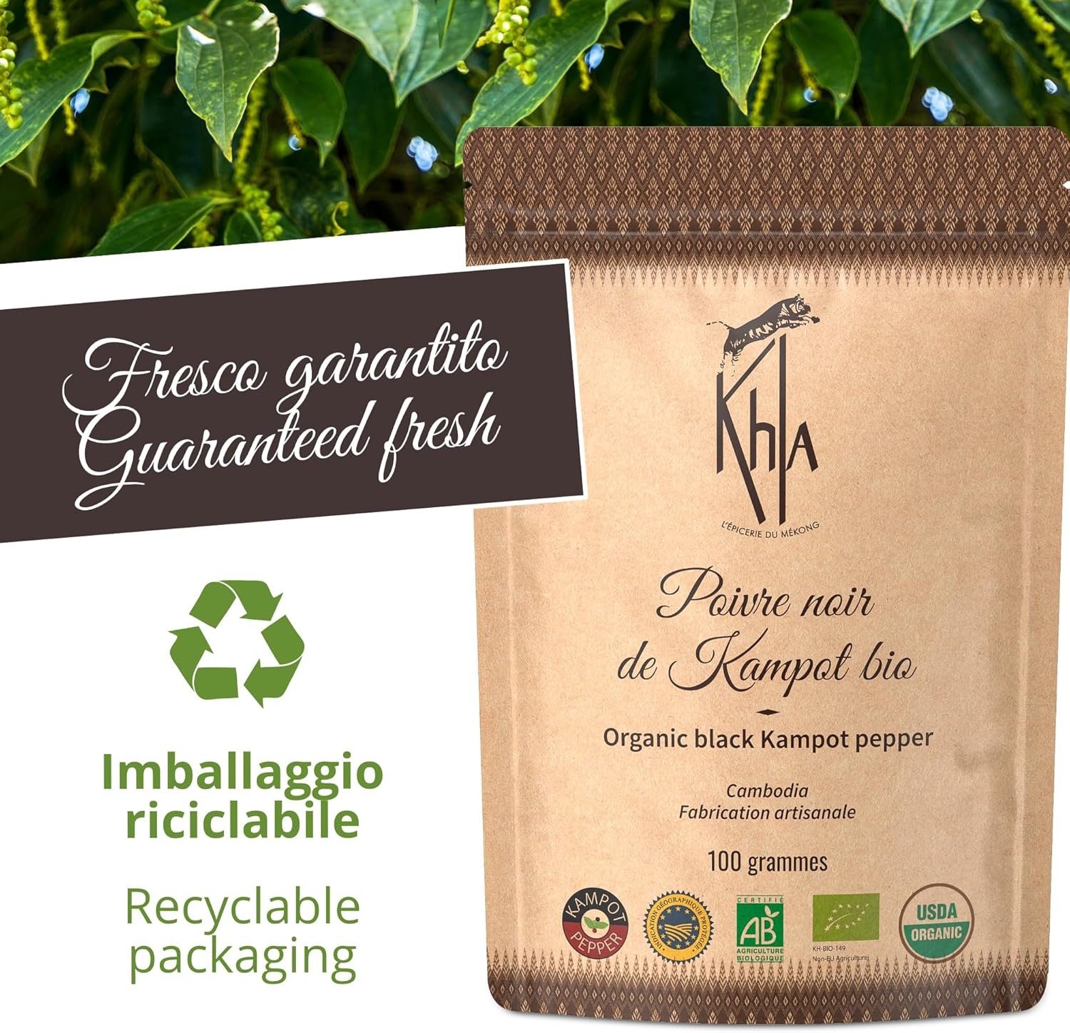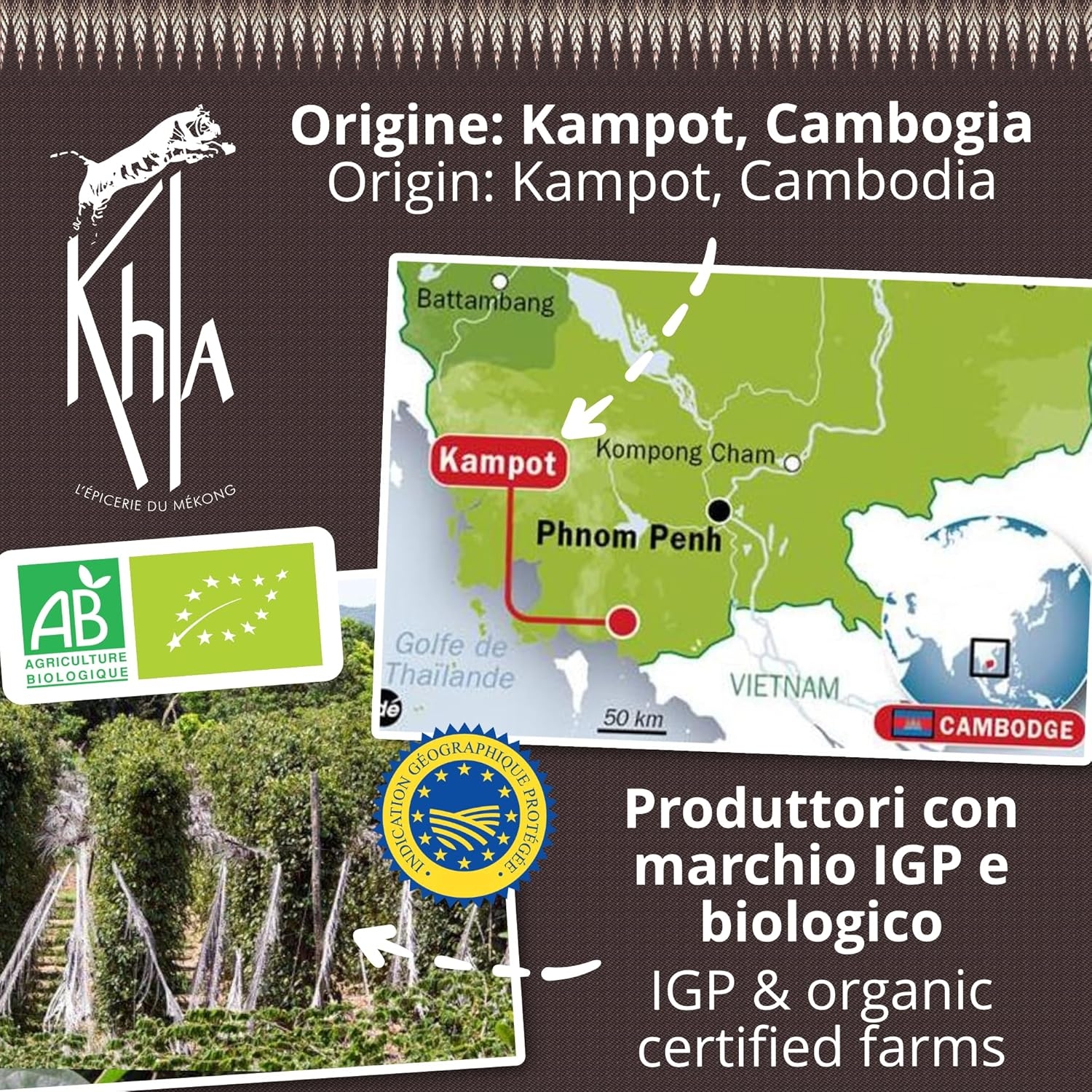 • ✅ DIRETTA DALL’ASIA – Khla, che significa “Tigre” in khmer, è un’azienda familiare franco-cambogiana situata a Kampot. Siamo specializzati in spezie e tè eccezionali, con sapori esotici, accreditamento IGP e commercio equo e solidale. Siamo orgogliosi di rifornirci direttamente da artigiani locali e di confezionare internamente i prodotti.