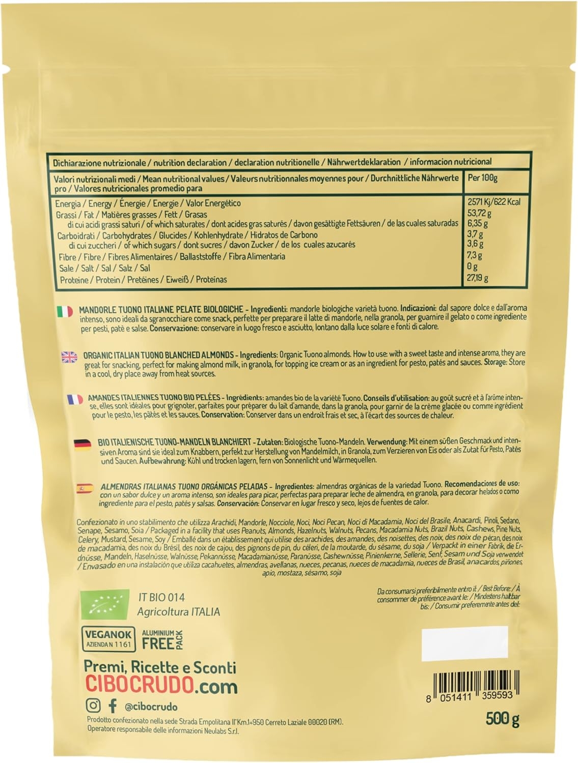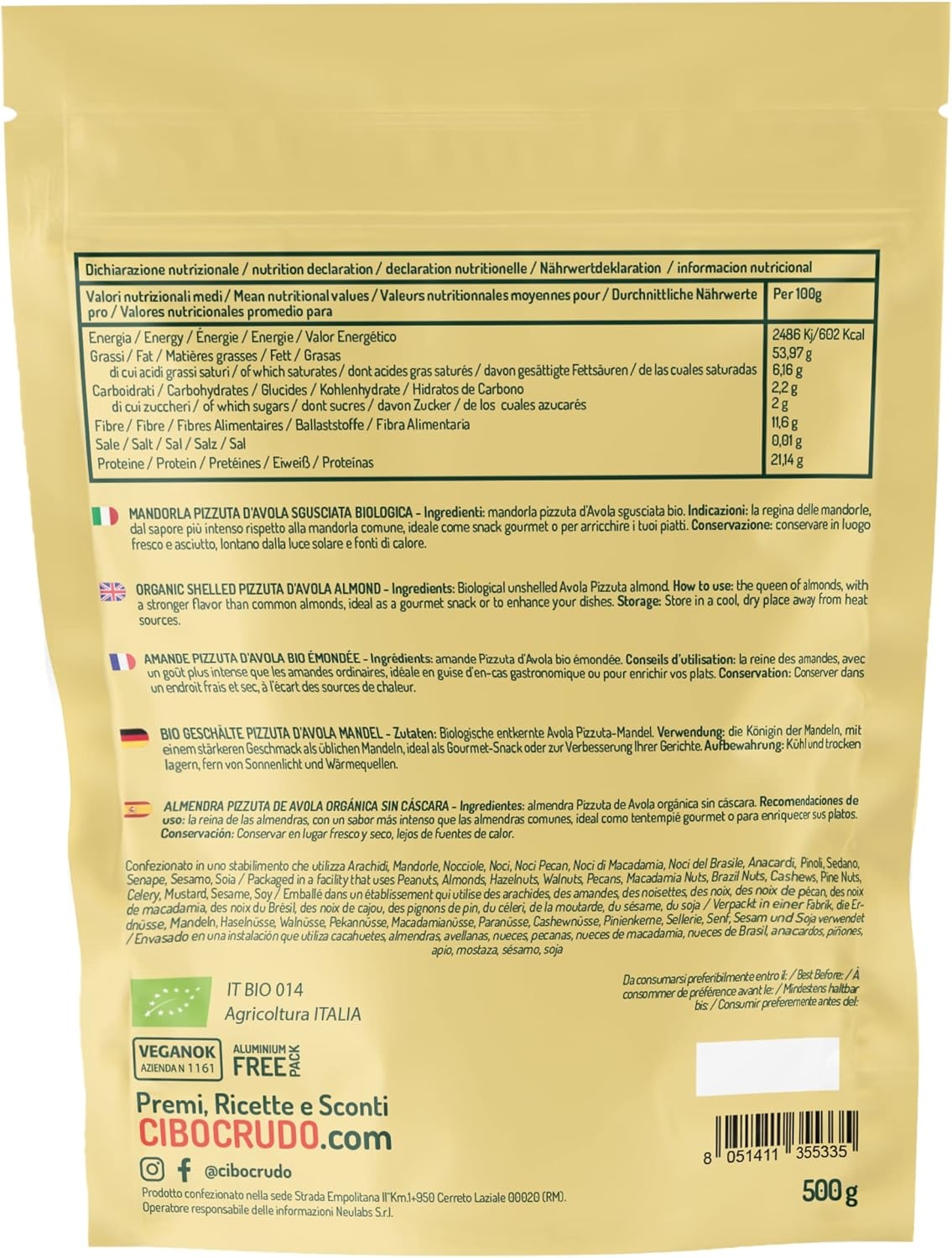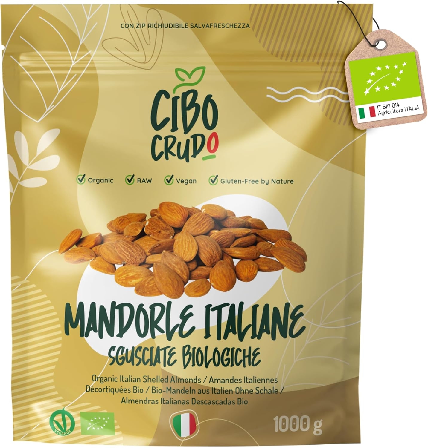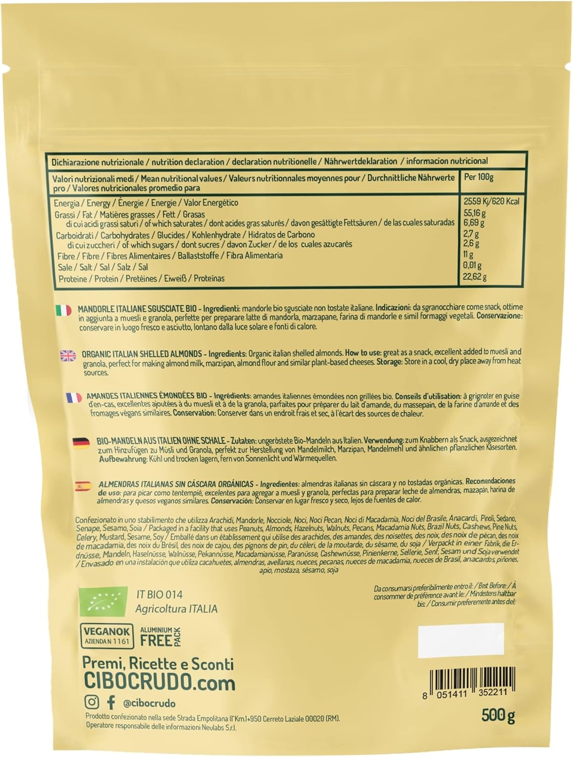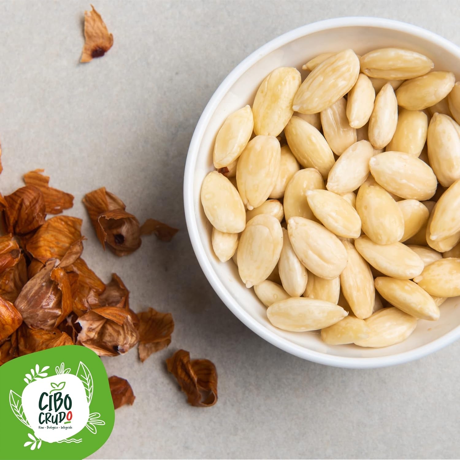 Le Mandorle sgusciate biologiche di CiboCrudo provenienti dalla Sicilia sono prodotte in coltivazioni biologiche e soprattutto sono crude, ovvero durante la filiera di produzione non subiscono alcun trattamento termico superiore ai 42°. Questa caratteristica nella coltivazione si percepisce nel gusto dolce e nella straordinaria croccantezza. Le mandorle siciliane CiboCrudo sono una fonte importante di: Proteine Carboidrati Acidi grassi insaturi Sali minerali è alto il contenuto di potassio, fosforo, magnesio e calcio Zinco, ferro, manganese, selenio e sodio in minore quantità Vitamine del gruppo E e J 18 amminoacidi Ti ricordiamo però che l’apporto calorico delle mandorle, come della frutta secca in generale, è piuttosto consistente e la dose giornaliera consigliata è di 50 gr, se non si desidera un aumento di peso significativo. Al contrario se il tuo obiettivo è prendere qualche chiletto in modo sano e naturale ti consigliamo di integrare questo alimento alla tua dieta! Esistono svariati modi in cui consumare questo delizioso alimento come: Torte e dolci alle mandorle Pane Gelato artigianale fatto in casa Latte vegano CiboCrudo produce alimenti lavorati a basse temperature sempre sotto i 42° privi di sostanze nocive e di glutine. I nostri prodotti sono 100% biologici, integrali e vegani ed utilizziamo tecniche di produzione artigianali per garantire il miglior risultato con il minor impatto sull’ambiente. Scopri il nostro vastissimo catalogo ricco di prodotti biologici, nutrienti e made in Italy! 😋🌎