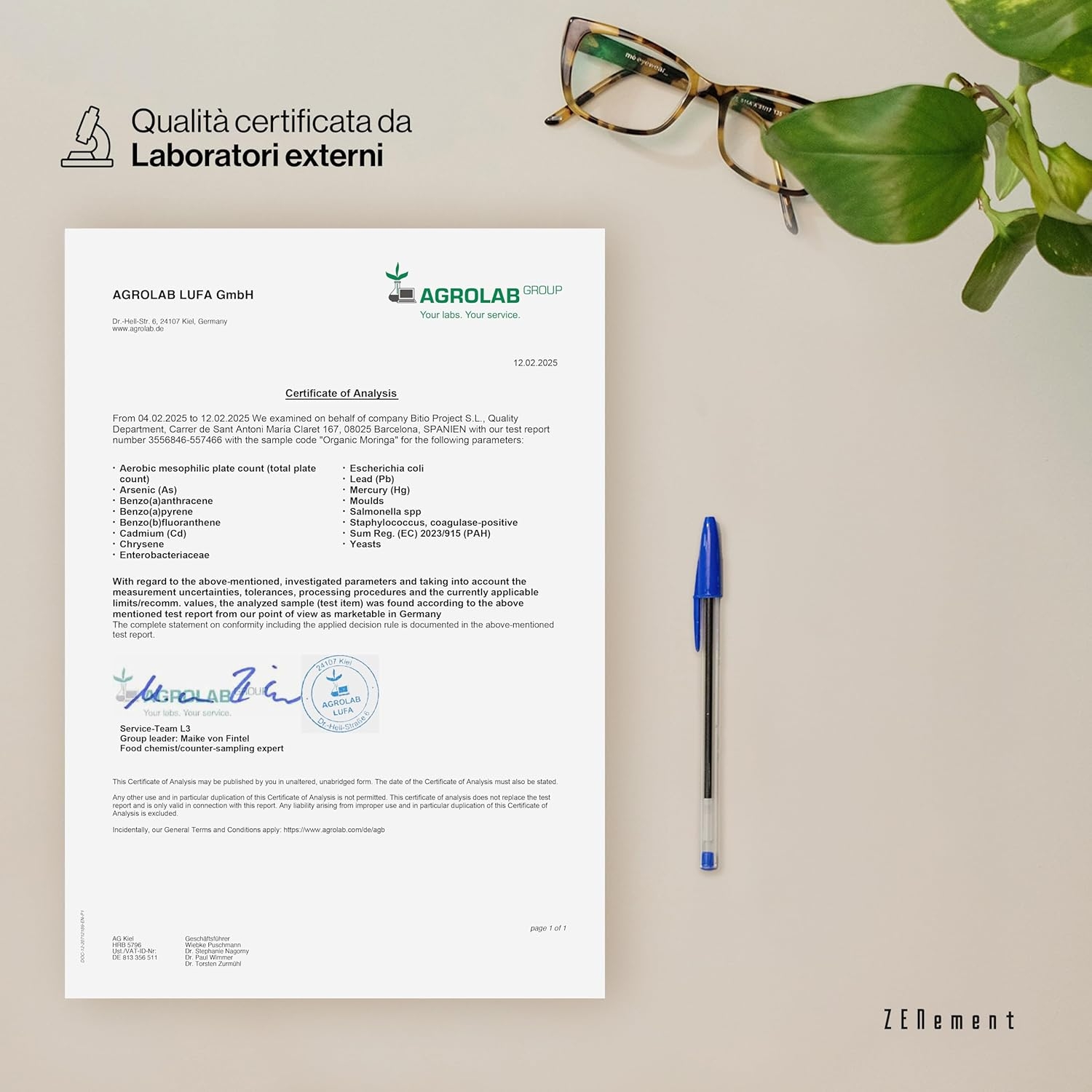 • Testato da Laboratorio Esterno: Le nostre capsule di Moringa sono state testate da un laboratorio accreditato. Effettuiamo analisi regolari in laboratori indipendenti accreditati per garantire la massima qualità del prodotto. Contattateci per maggiori informazioni, saremo lieti di aiutarvi.