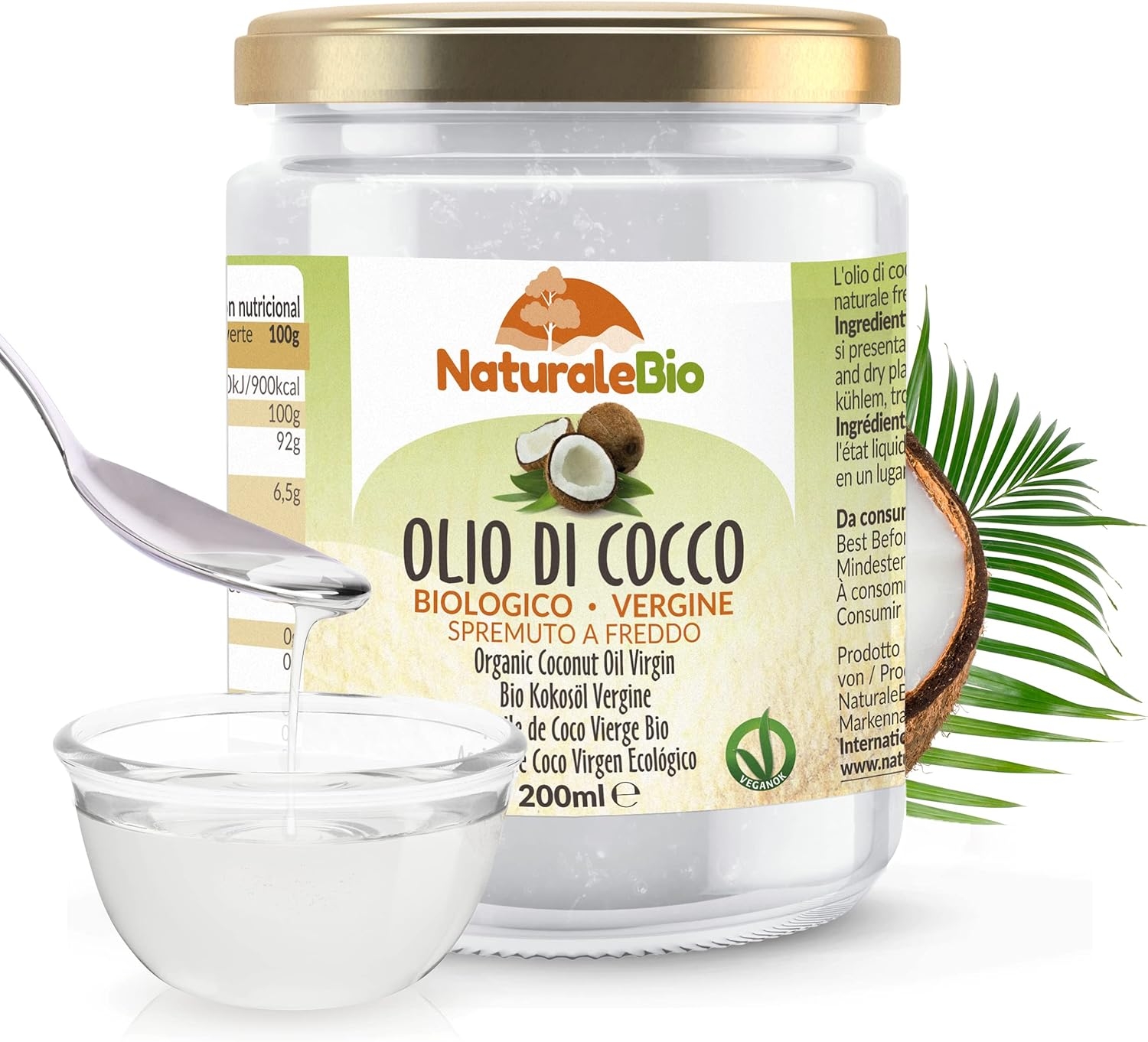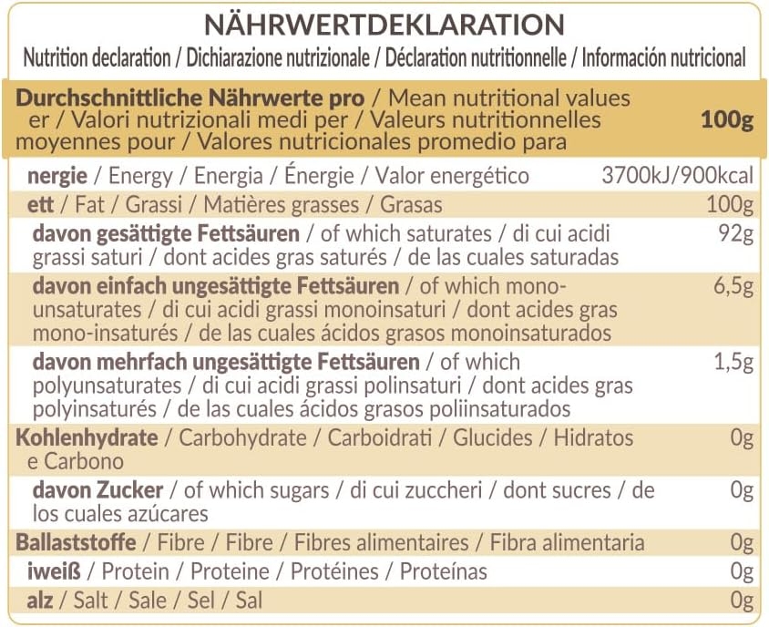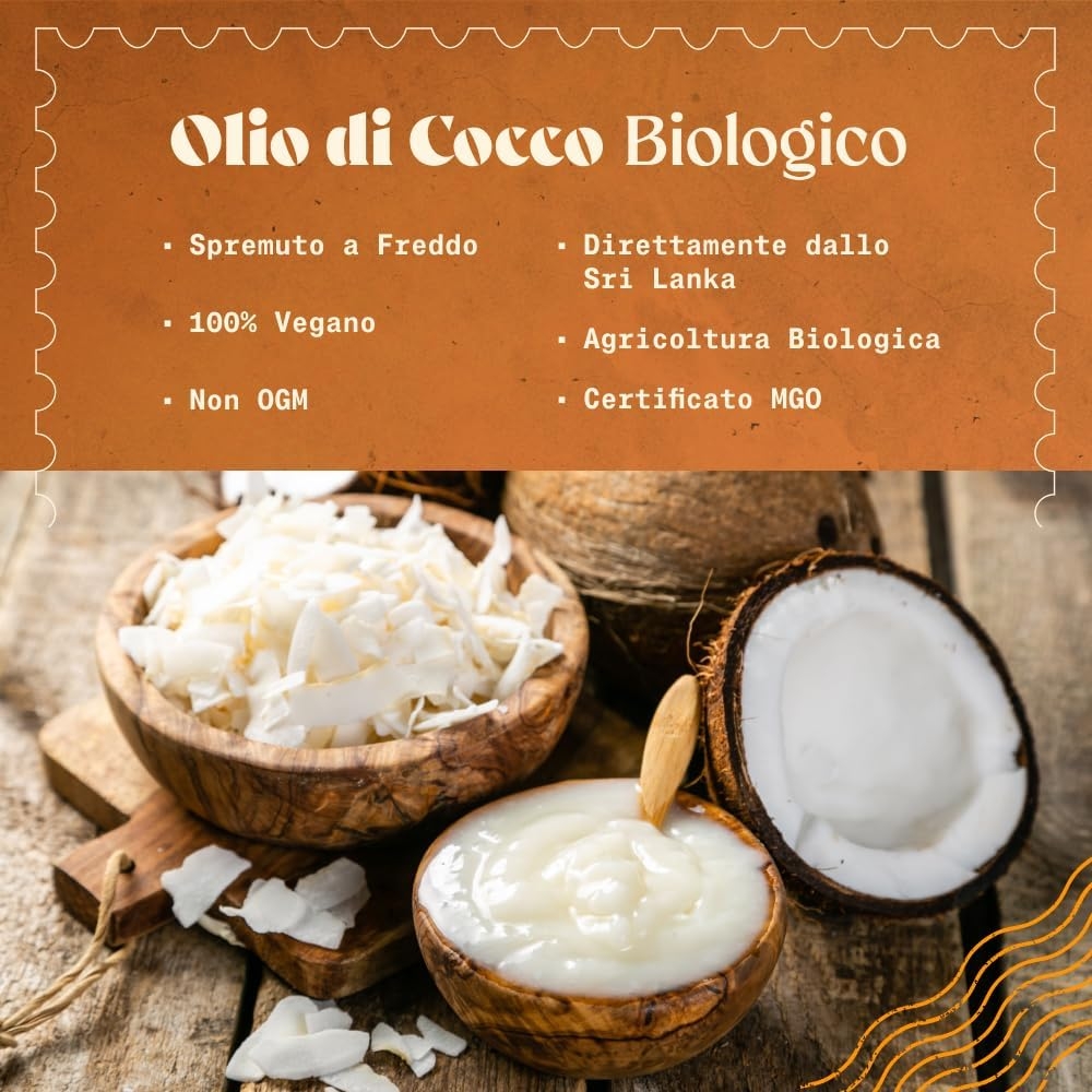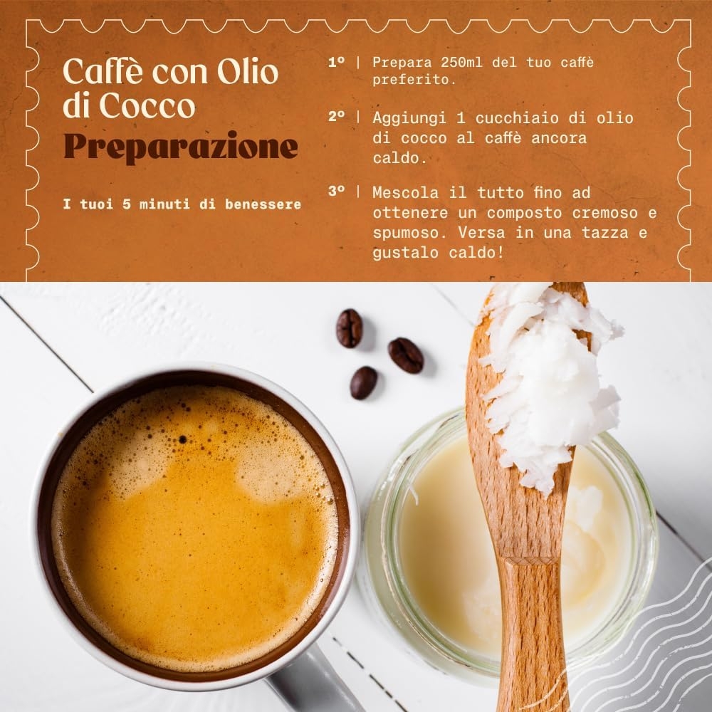 • PRINCIPALI UTILIZZI: L’olio è davvero un alimento versatile, che può essere usato per tutti i tipi di cottura. Per prepare dolci e bevande, ma anche per dare un tocco esotico alle tue ricette salate. Inoltre, può essere utilizzato come trattamento naturale per la routine di bellezza quotidiana di corpo e capelli.