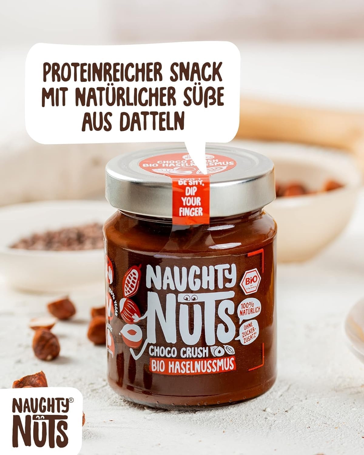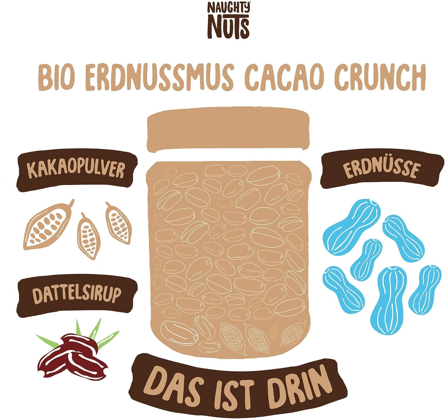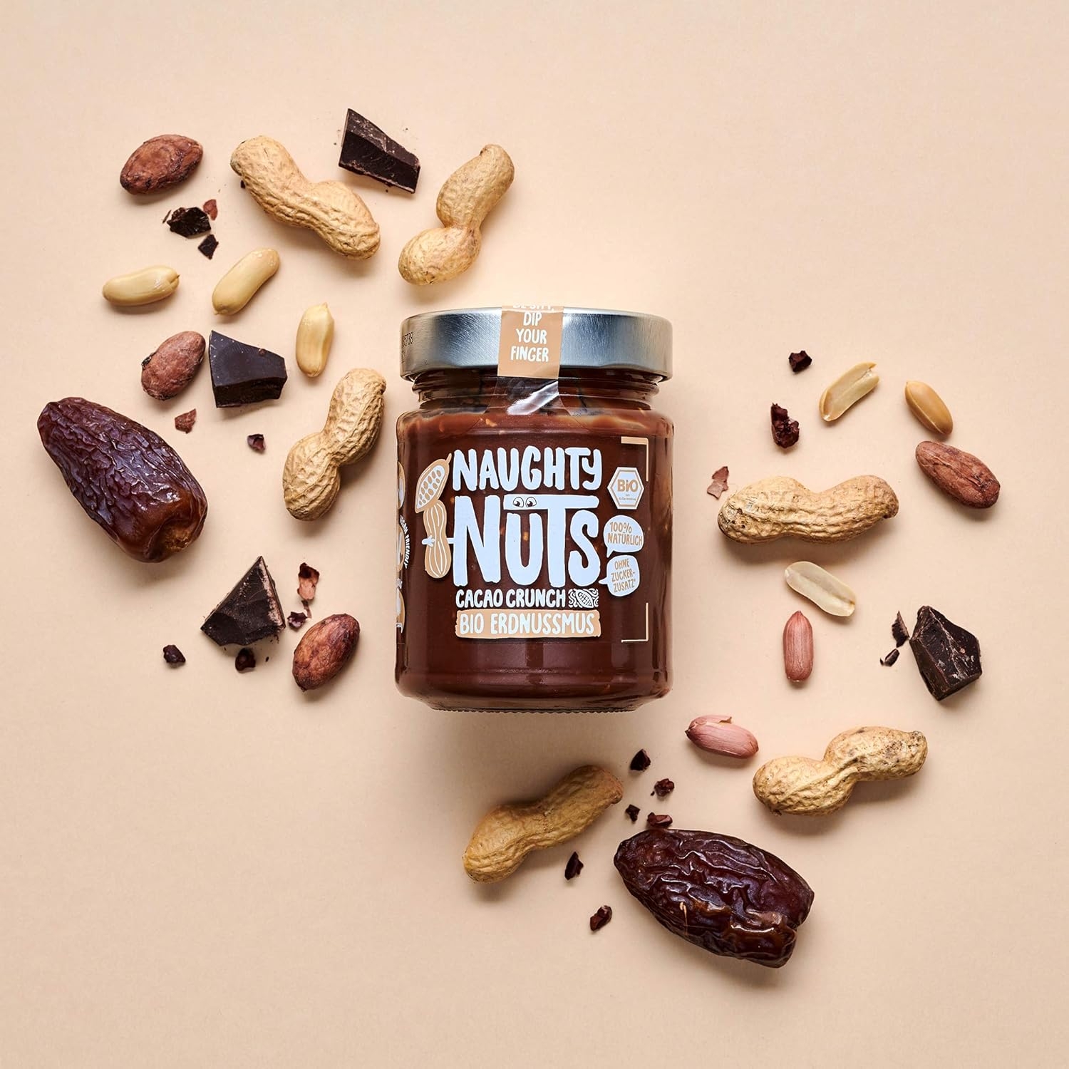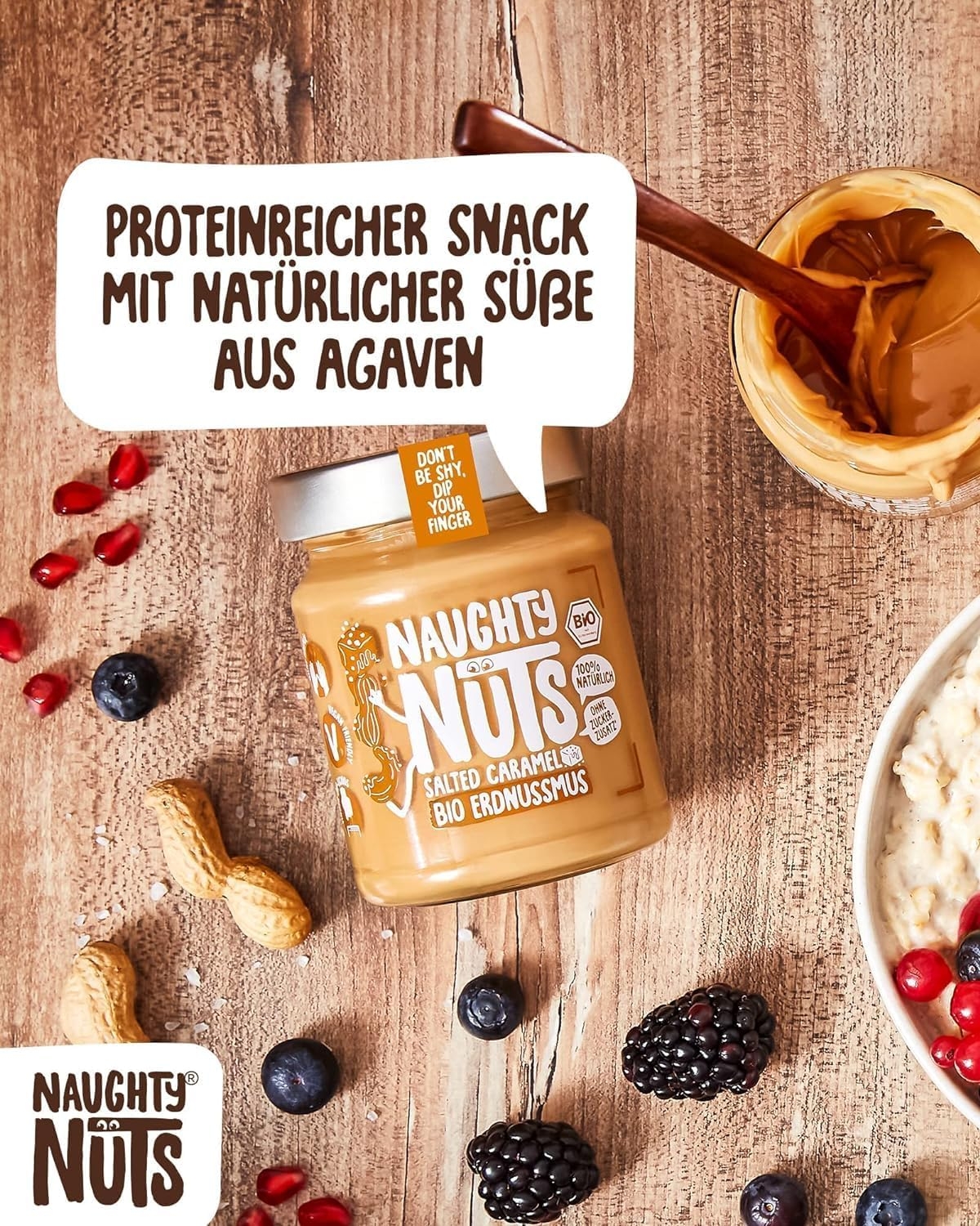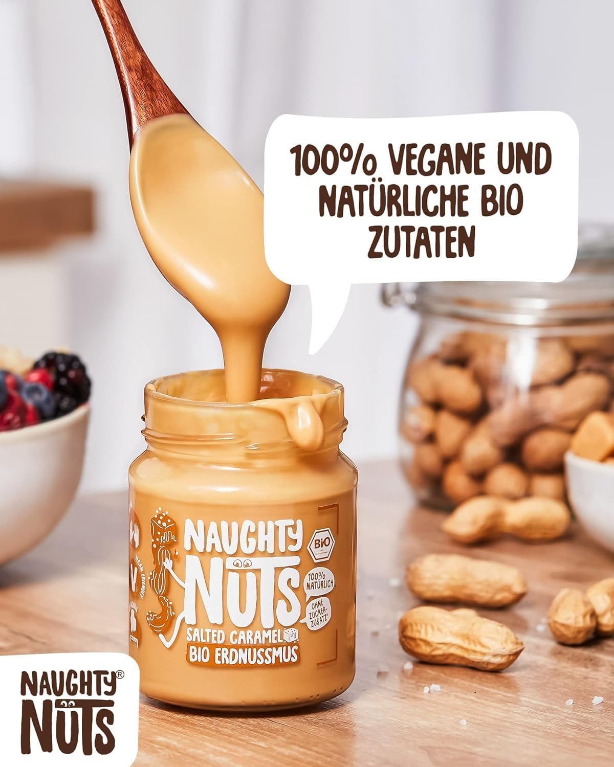 1. POLTIGLIA DI NOCI NO-FRIEND Crediamo che sia deliziosa senza fronzoli. Naughty Nuts è sempre composta da un breve elenco di ingredienti BIOLOGICI naturali al 100%. Lo promettiamo! Non usiamo olio di palma o zuccheri aggiunti. Crediamo anche che Animal i prodotti non trovano posto nei nostri burri di noci, motivo per cui tutti i nostri prodotti sono vegani. 2. SORPRESA CON LE NOCI Con le nostre straordinarie ricette ti assicuriamo un’esplosione di gusto in bocca. Boom! Ti offriamo burro di noci realizzato con ingredienti di altissima qualità, tostati alla perfezione. Che si tratti di uno spuntino veloce direttamente dal barattolo, come condimento per il tuo frullato o per perfezionare vari piatti salati, pensiamo che il burro di noci abbia sempre un buon sapore e si adatti quasi a tutto. Rimani creativo, rimani cattivo! Sviluppiamo nuove ricette calde per te. 3. RENDERE IL MONDO UN PO’ MIGLIORE PASSO DOPO PASSO. Ora sta diventando cattivo, andiamo nudi. Non vogliamo illuderti e svelarti in modo trasparente l’origine della nostra frutta secca. La nostra piccola frutta secca biologica proviene attualmente dall’Italia, dalla Spagna (mandorle), dall’Egitto e dalla Cina (arachidi). In linea con lo spirito green, anche il tema della sostenibilità è per noi molto importante. Grazie alla collaborazione con CarbonCloud dalla Svezia, possiamo calcolare l’impronta di Co2 dei nostri singoli prodotti e ottimizzarli continuamente. Ma non vogliamo tenerlo solo per noi, in modo che possiate comprendere l’impronta di Co2 di ogni prodotto e prendere una decisione consapevole.