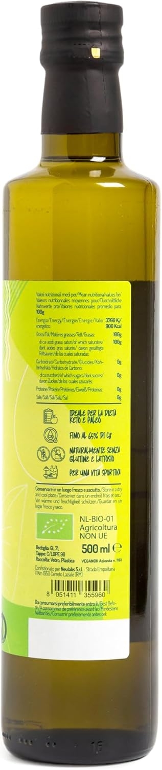 Olio di Cocco Biologico MCT C8 C10 Spremuto a Freddo – 500ml. Olio di Cocco Alimentare Puro e Bio con Acidi Grassi a Catena Media MCT C8 e C10 uso Keto Paleo Corpo o Capelli. Organic Coconut Oil MCT.
