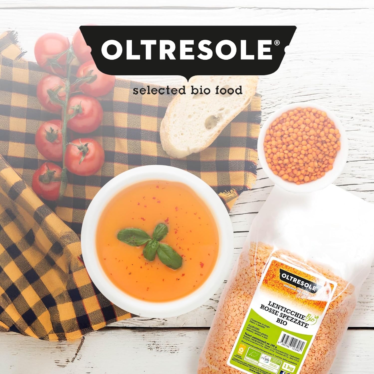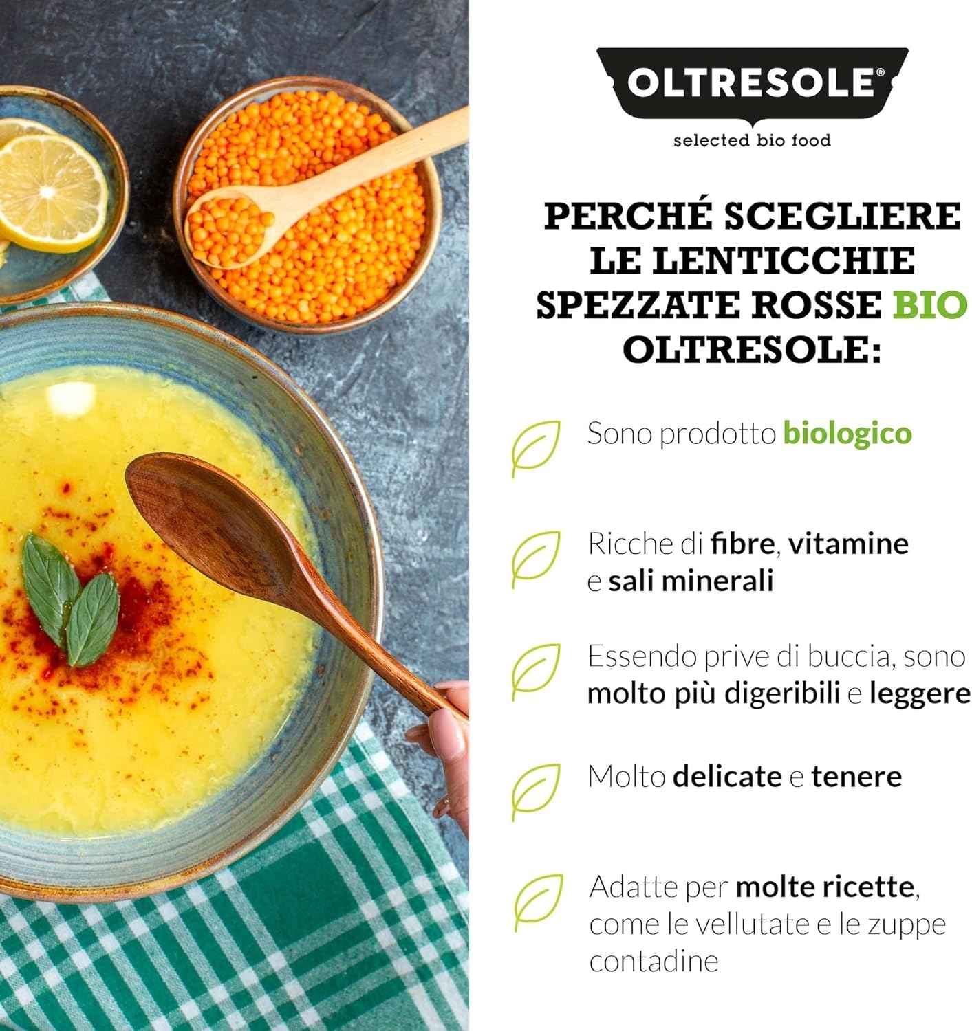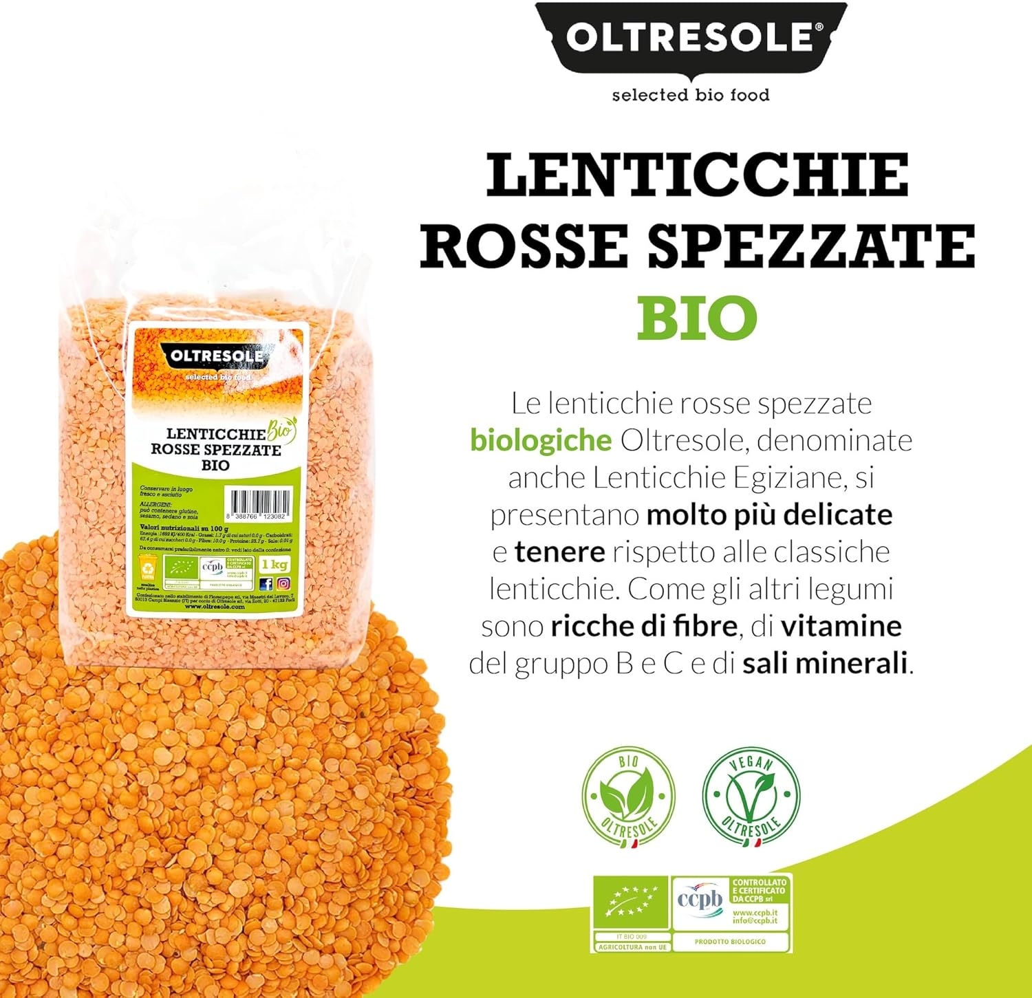 Oltresole, Lenticchie Rosse Spezzate Biologiche 1 Kg, Legumi Secchi Bio Decorticati e Spezzati, Non Richiedono Ammollo, Fonte di Proteine e Fibre, Confezione Ideale per Famiglie