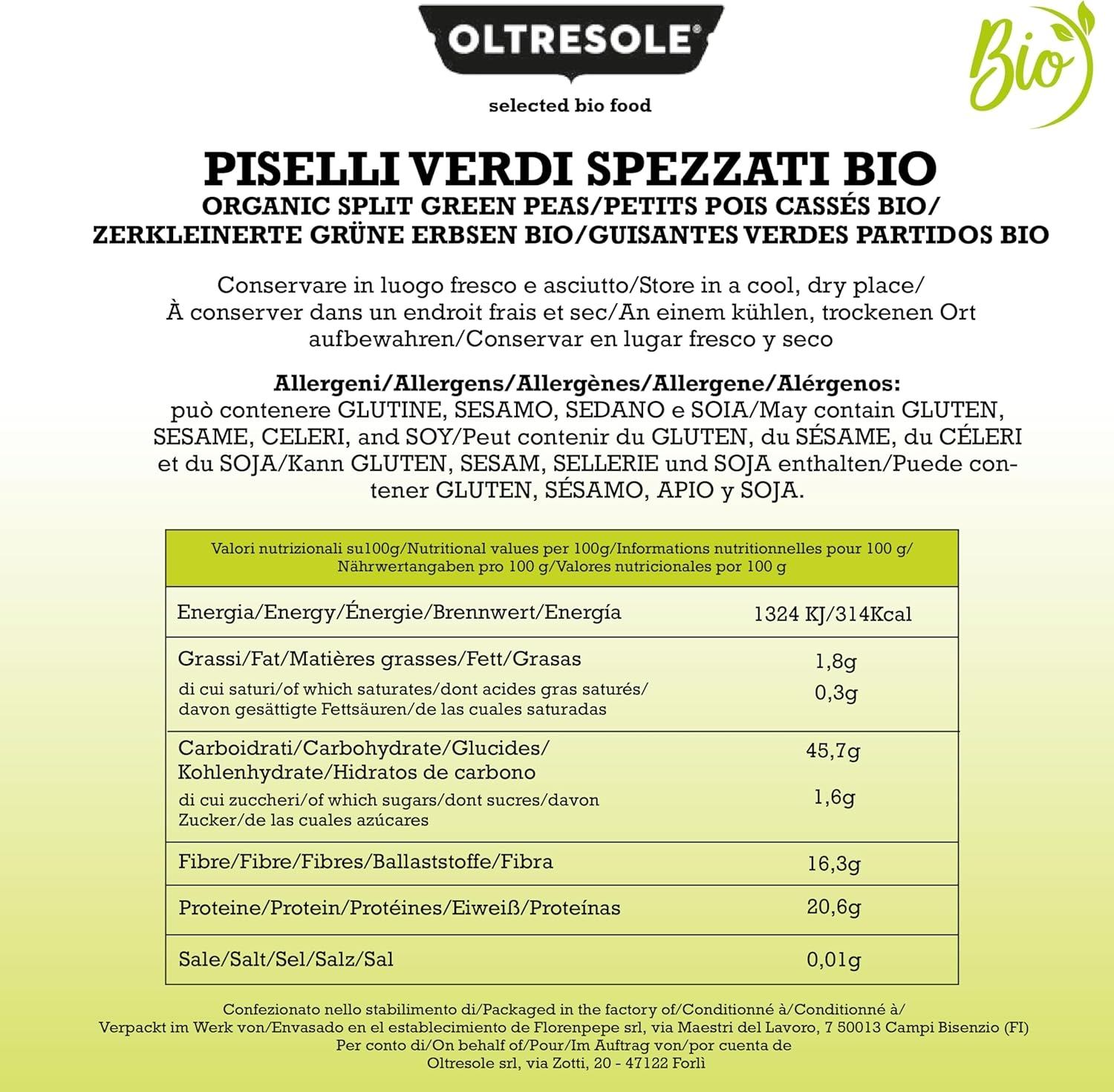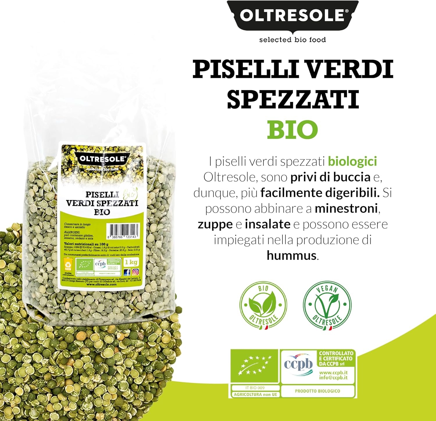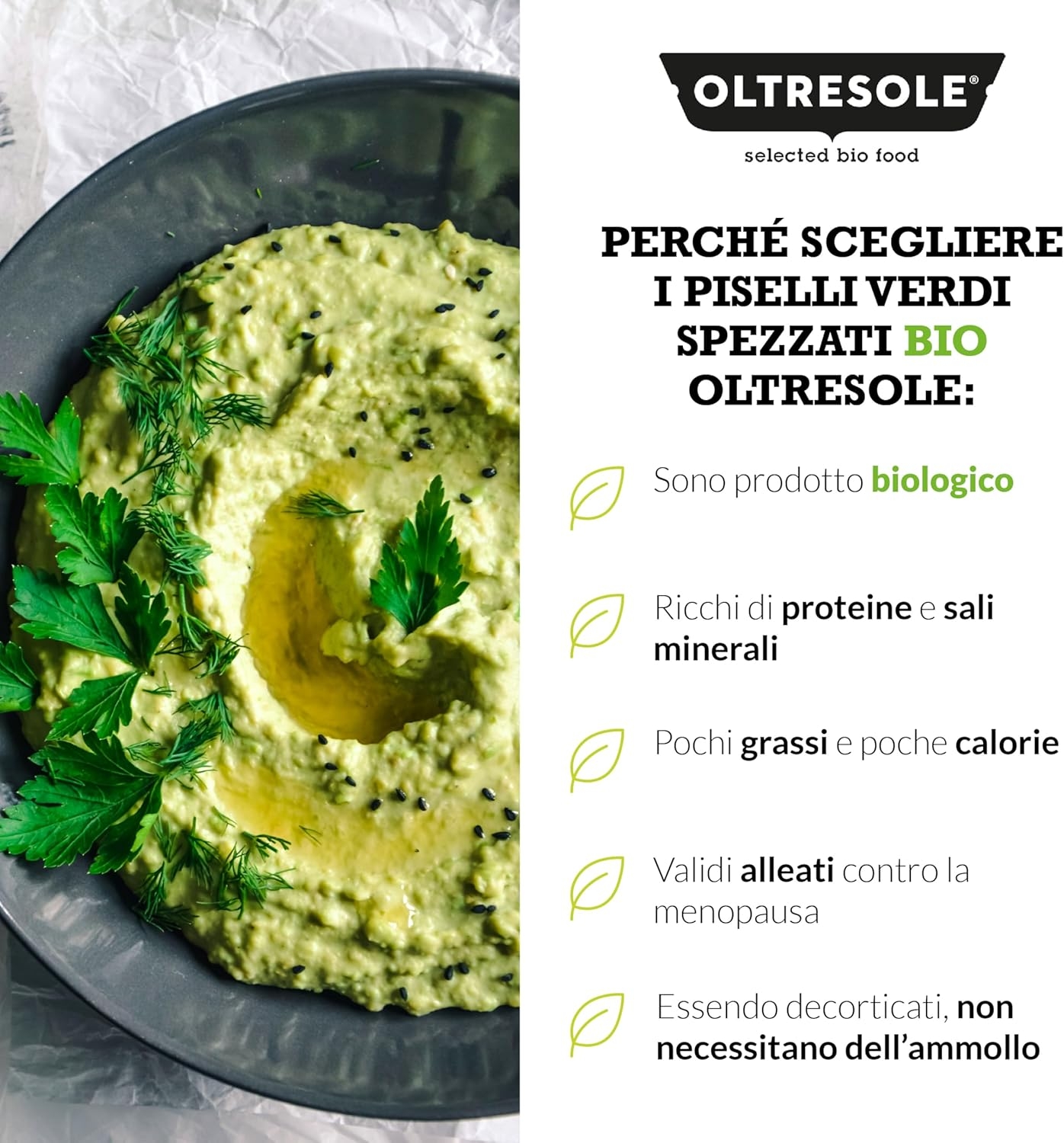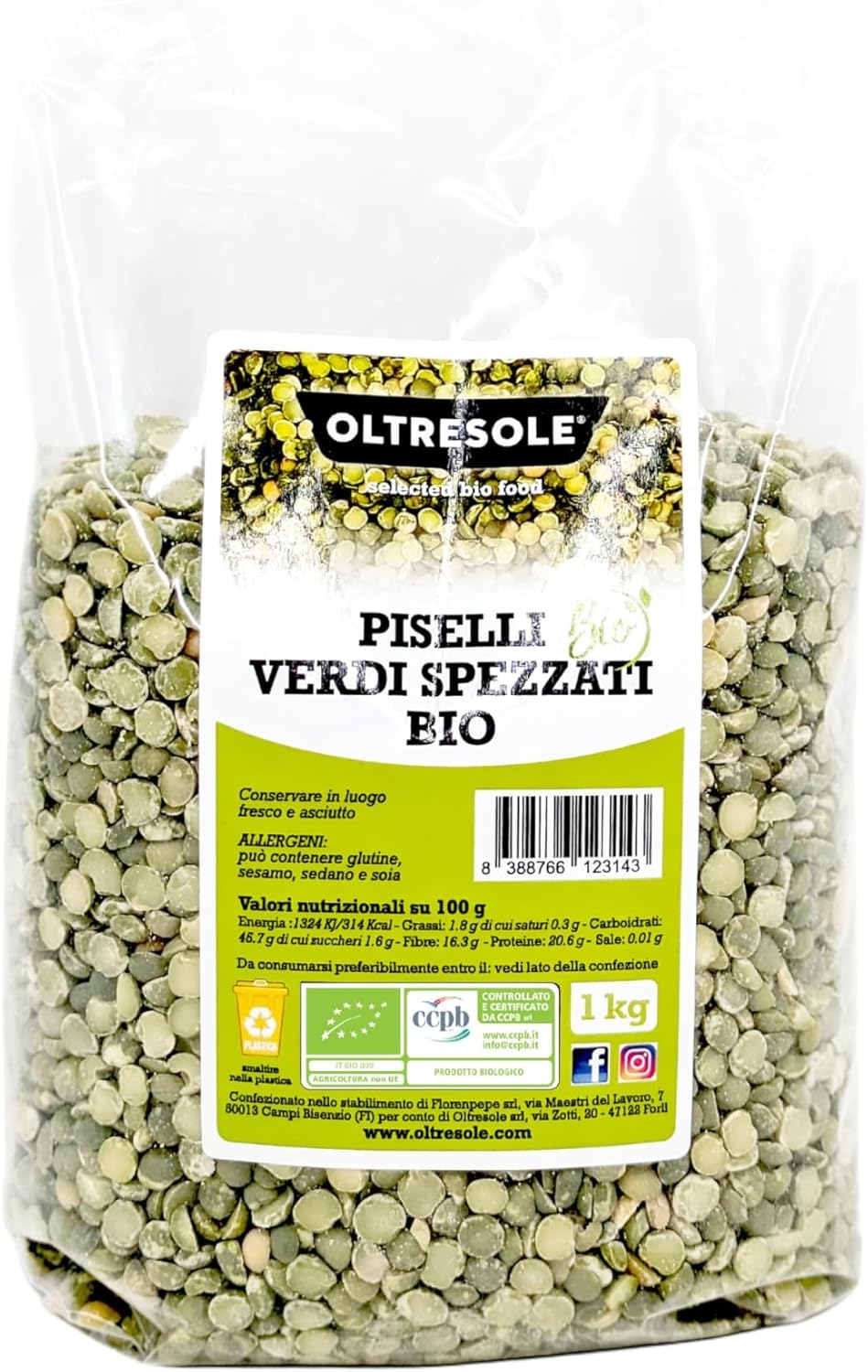 I piselli verdi spezzati biologici Oltresole si presentano come dei legumi spezzati, decorticati e dotati di una forma sferica. A differenza dei classici piselli, questi sono privi di buccia e ciò li rende molto più digeribili, leggeri e ideali per le diete ipocaloriche in quanto hanno un basso contenuto di grassi e di amido. Inoltre, si presentano ricchi di proteine e di sali minerali come per esempio potassio e fosforo. Oltre alle proteine e sali minerali, i piselli verdi spezzati biologici Oltresole, sono ricchi di fibre, quindi vi donano il giusto apporto energetico. Essendo decorticati, i piselli verdi, possono essere subito cotti e non necessitano, come altri legumi dell’ammollo. Dal punto di vista culinario, i piselli verdi spezzati biologici Oltresole, si presentano utili per la preparazione di deliziose ricette come vellutate, zuppe, minestre, risotti ma anche hummus e burger. I piselli verdi, previa cottura, si caratterizzano per il gusto delicato e dolce, quindi perfetti per arricchire primi o secondi piatti.