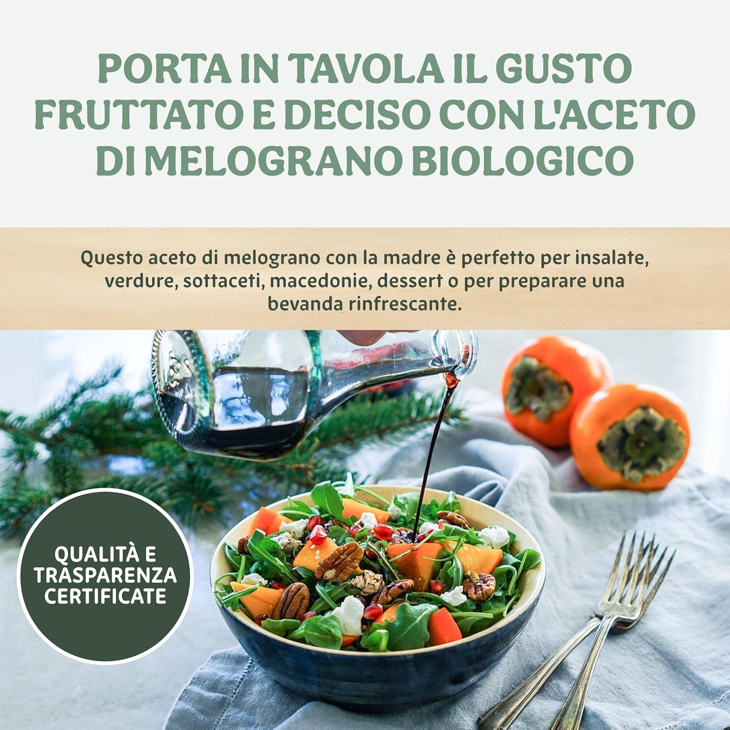 • Ideale per uso culinario e come condimento: compagno perfetto per ricette gourmet, questo aceto di melograno esalta insalate, marinate, dessert e salse con la sua dolcezza naturale e il suo gradevole sapore fruttato, conferendo un tocco raffinato ai tuoi pasti.