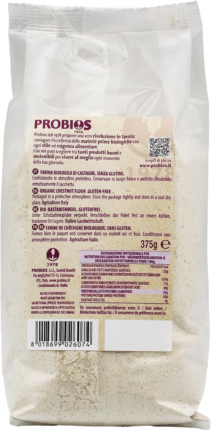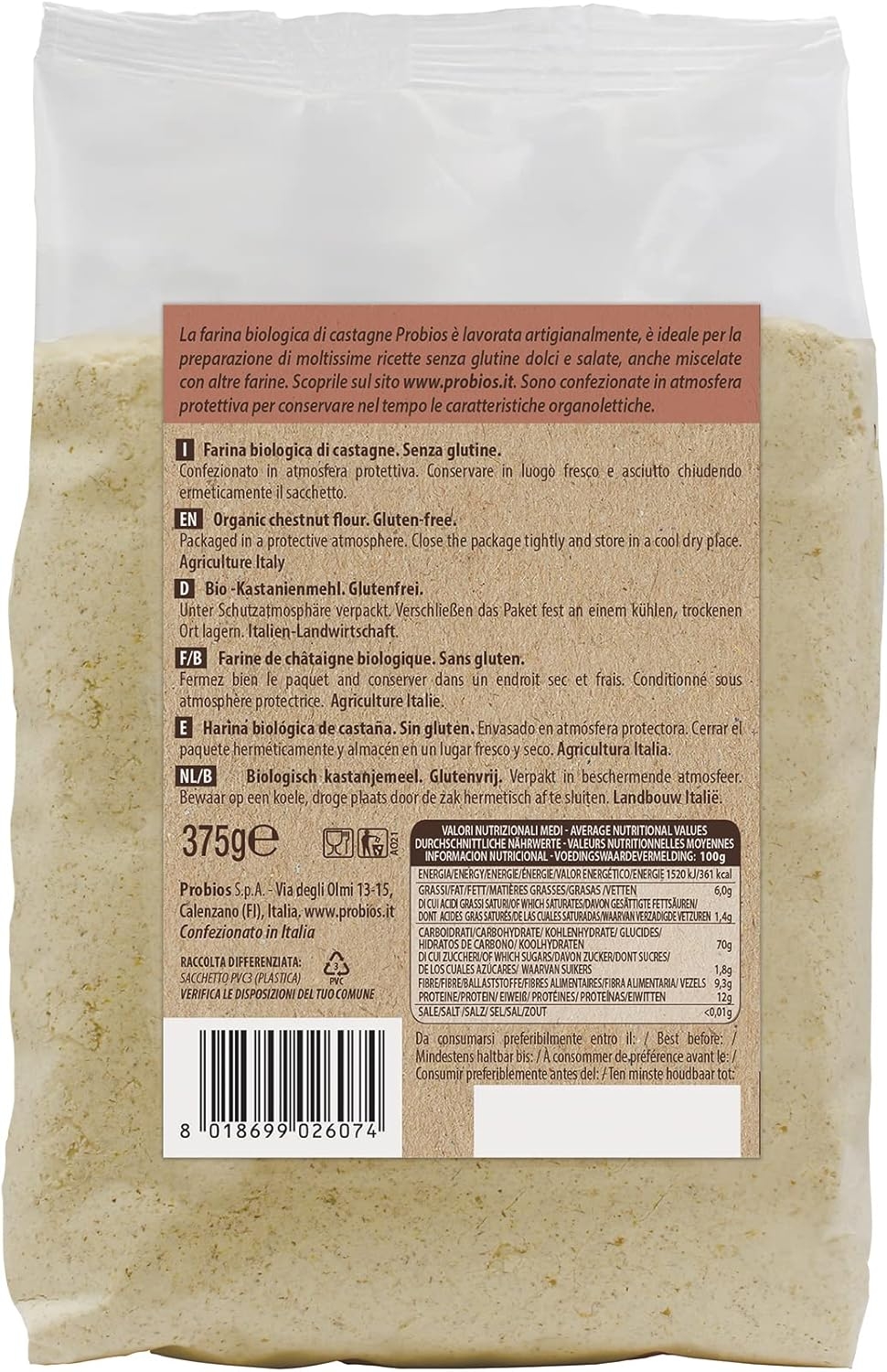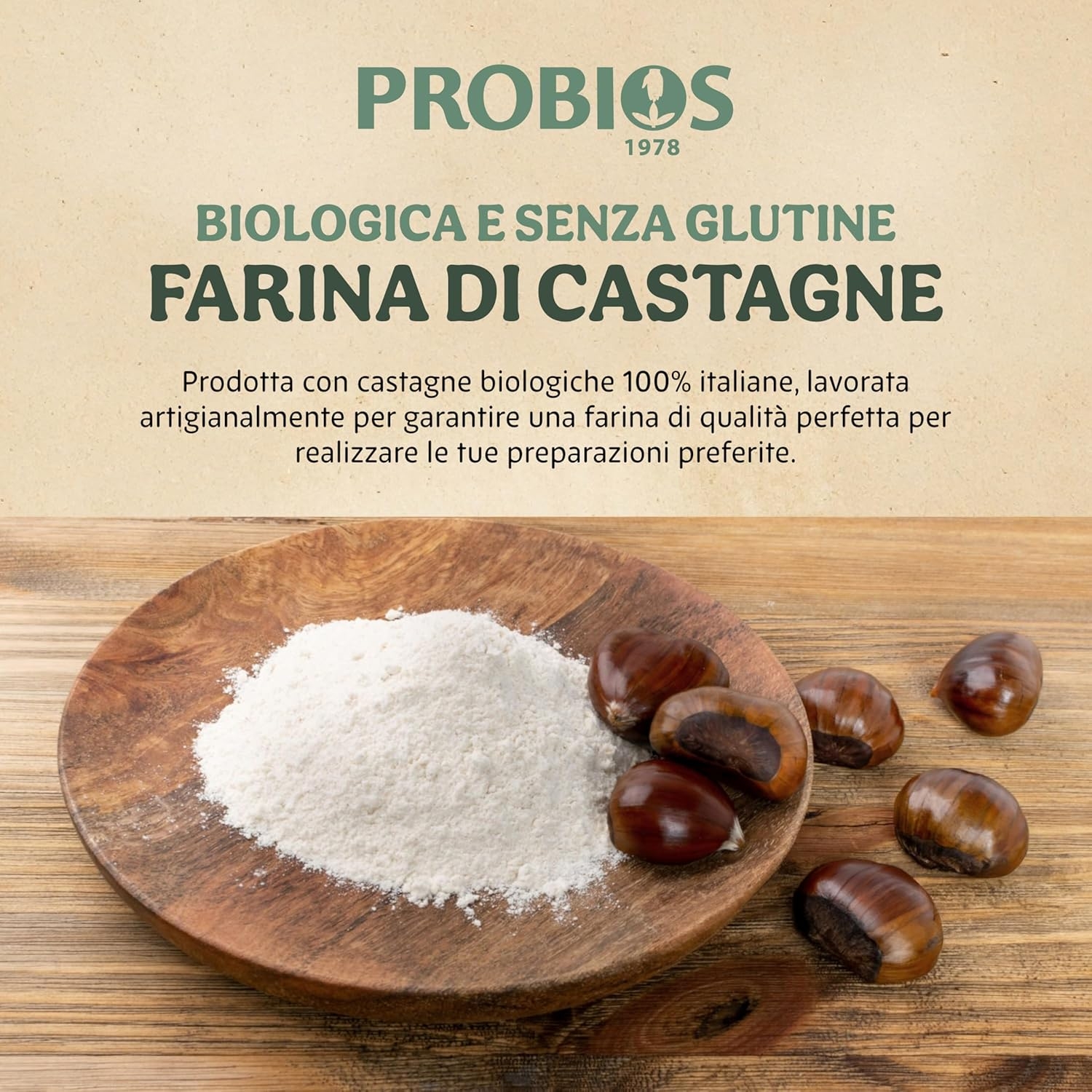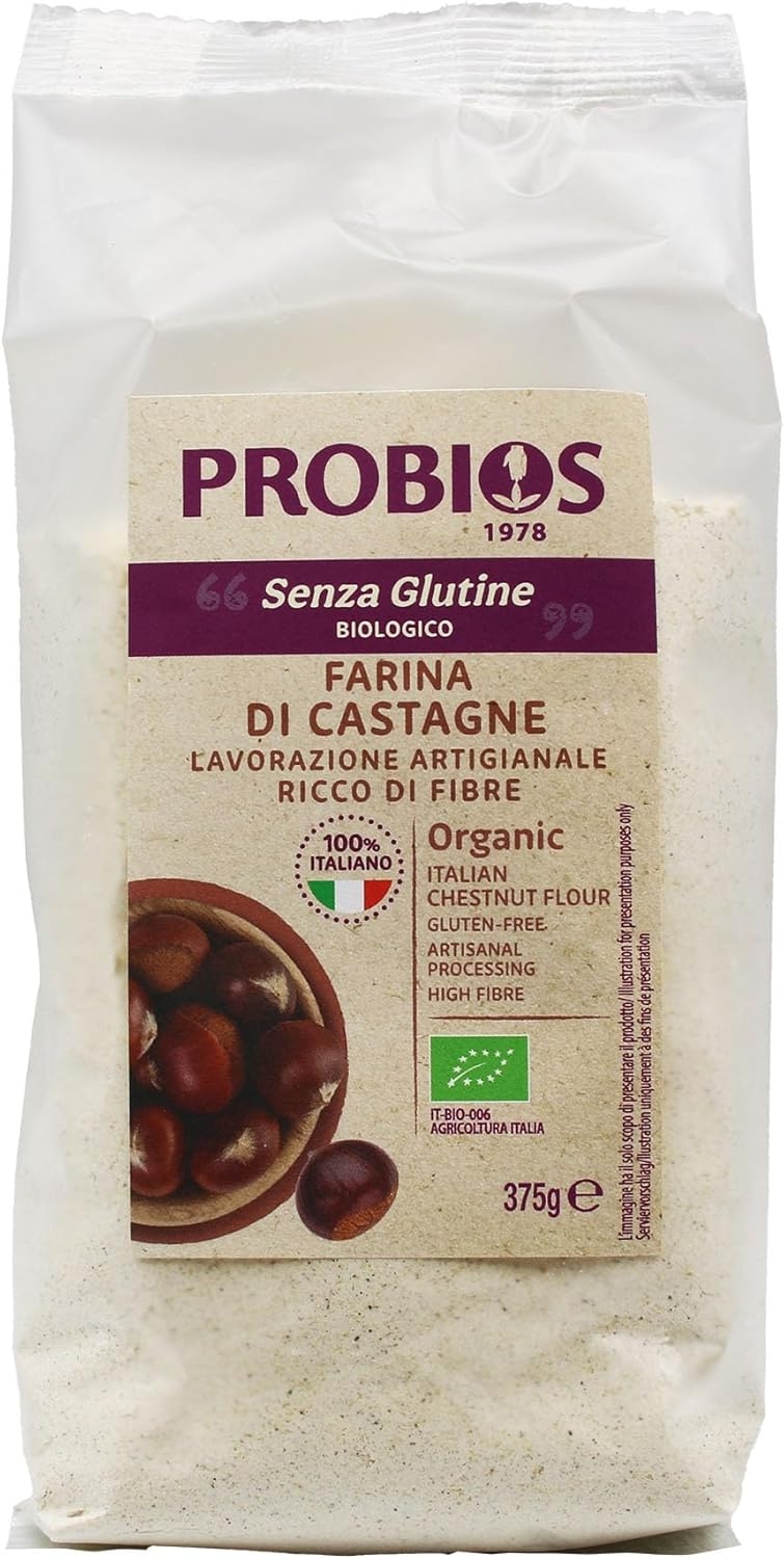 La Farina di castagne Probios è una farina 100% castagne biologiche italiane. La lavorazione artigianale della materia prima garantisce una farina di qualità perfetta per realizzare le tue preparazioni preferite a base di questo frutto tipicamente autunnale. Ricca di fibre, è garantita senza glutine e disponibile in formato da 375g