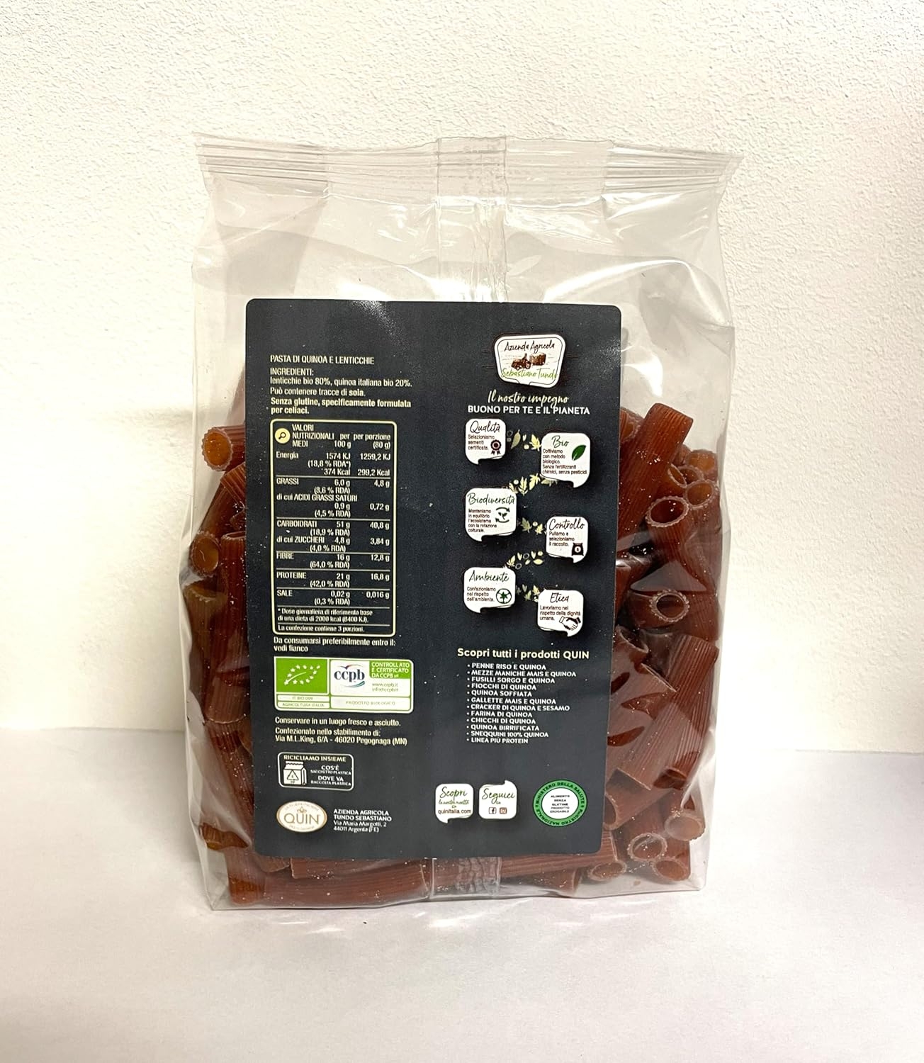 La nostra pasta di lenticchie e quinoa è realizzata con materie prime biologiche 100% italiane, trafilata al bronzo. Senza glutine e ad alto contenuto proteico.