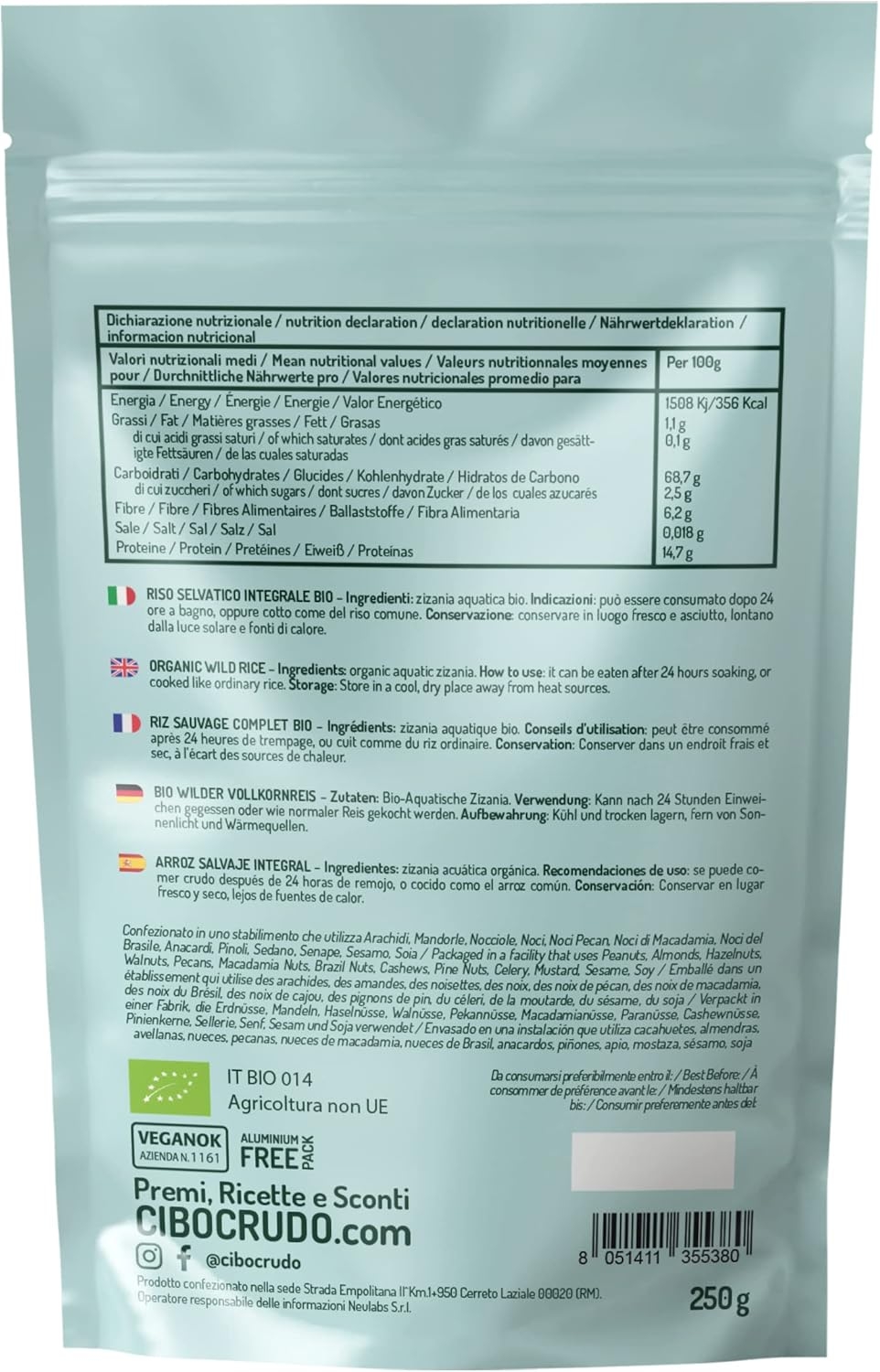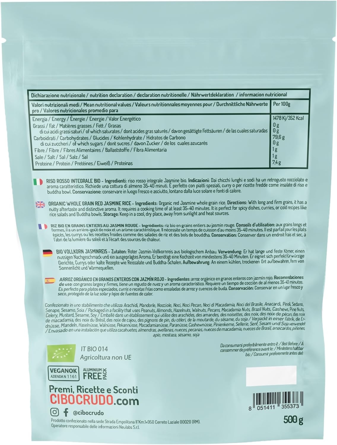 • INTEGRALE – il Riso Rosso di CiboCrudo non ha subito alcun trattamento o precottura: è un prodotto integrale, ricco di fibre e di nutrienti benefici, vegan e naturalmente privo di glutine