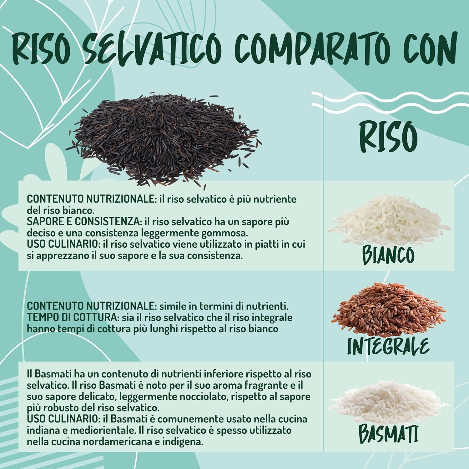 • RICETTE – questo riso ha chicchi lunghi e sodi, retrogusto nocciolato e aroma caratteristico: perfetto per essere abbinato a piatti speziati e curry o nei piatti freddi come insalate di riso e buddha bowl