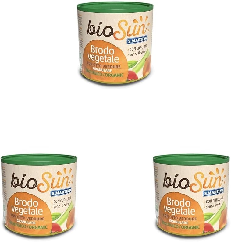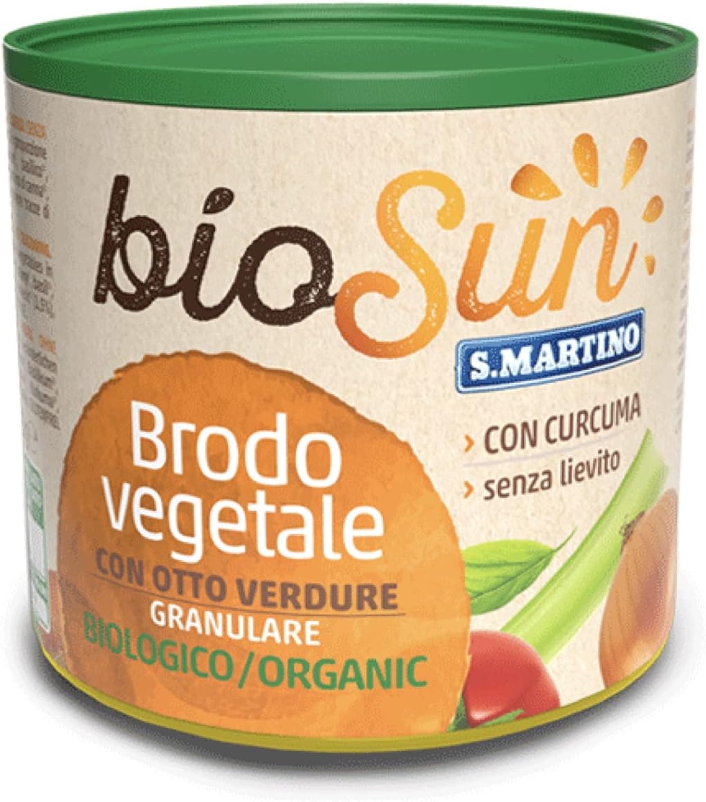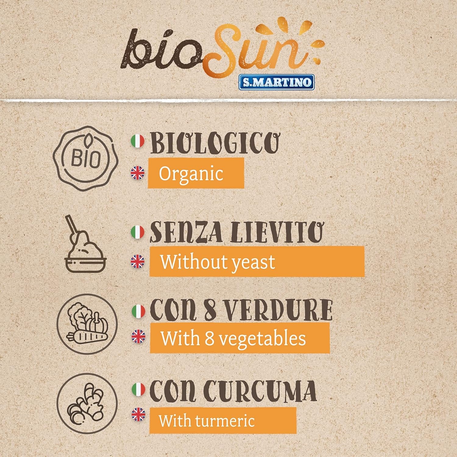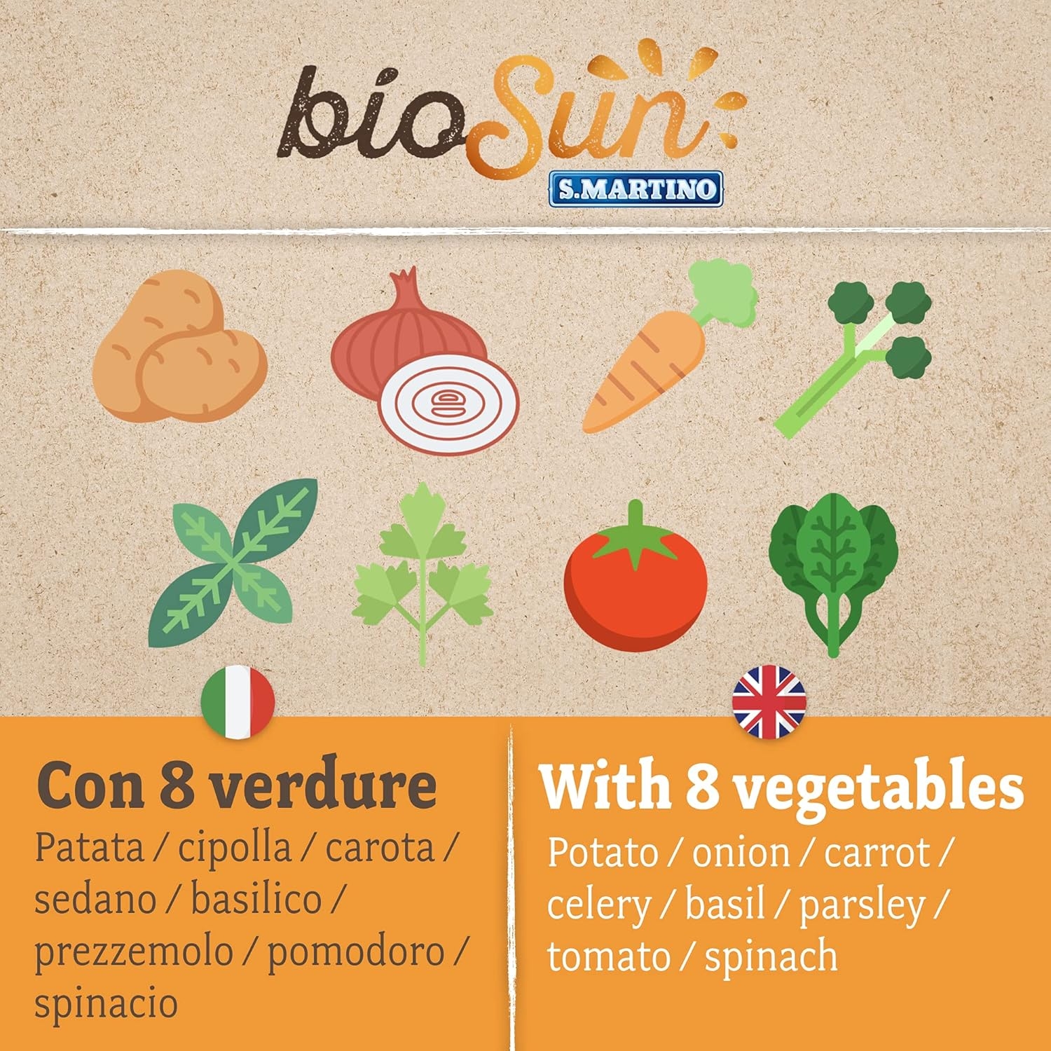 - 📝INGREDIENTI – Sale, 30% di verdure di 8 tipi diversi (patata, cipolla, carota, sedano, basilico, prezzemolo, pomodoro e spinacio), farina di mais, zucchero di canna, curcuma (1,5%), noce moscata. Tutti gli ingredienti sono biologici. Può contenere tracce di lattosio. La linea BioSun garantisce il proprio costante impegno nel rispetto e nella salvaguardia dell’ambiente, utilizzando materie prime di qualità, selezionate, provenienti da agricoltura biologica e senza l’utilizzo di prodotti chimici