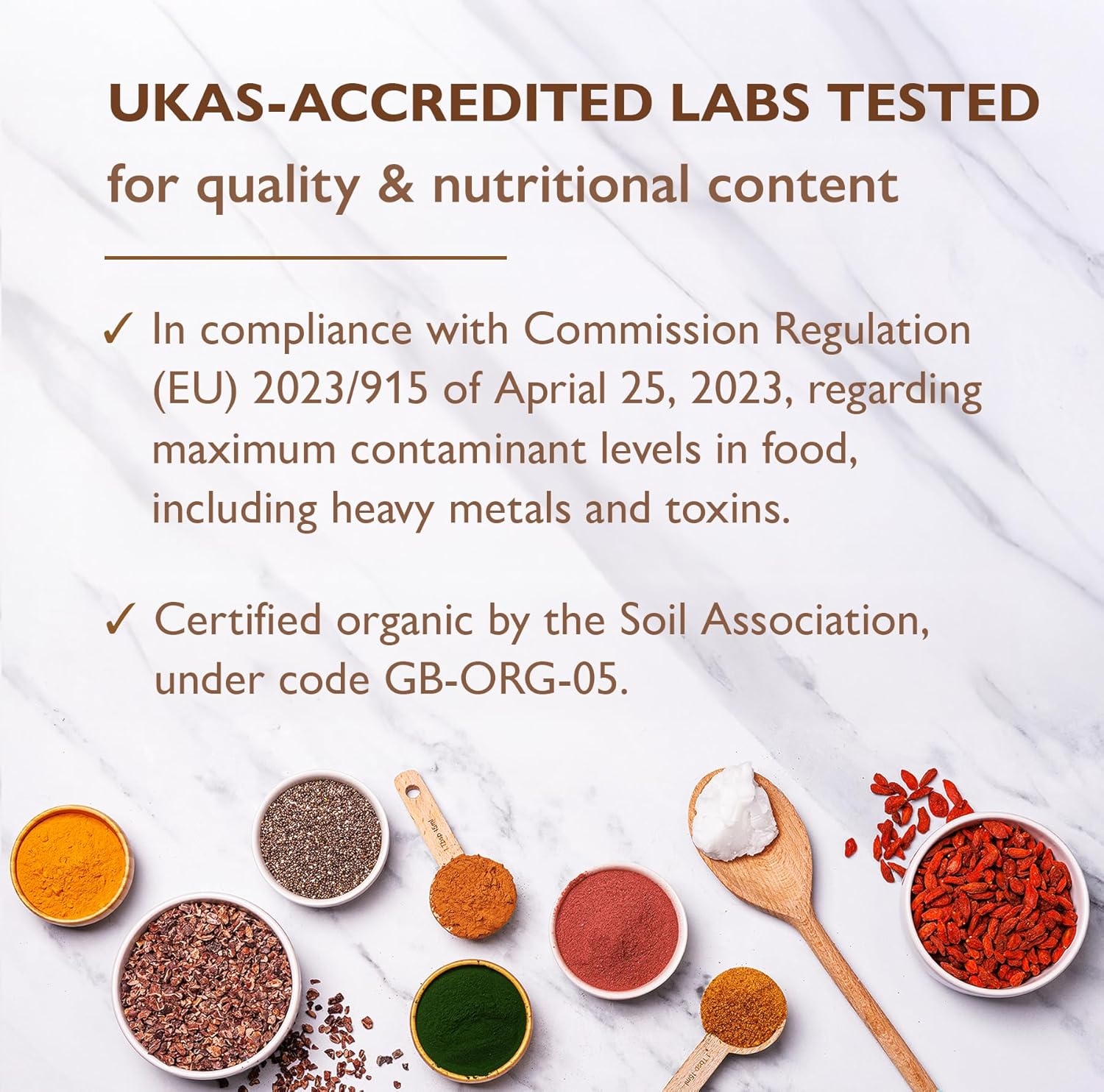 • 100% puro e biologico: ingredienti di origine vegetale senza additivi o Conservanti. I nostri prodotti rispettano pratiche di sostenibilità ambientale e sono sottoposti a rigorosi test per metalli pesanti e micotossine, certificati secondo gli standard biologici UE secondo il Regolamento (UE) 2018/848 e i Great British Organic Standards della Soil Association con il codice GB-ORG-05. Senza OGM, senza allergeni, non irradiati.