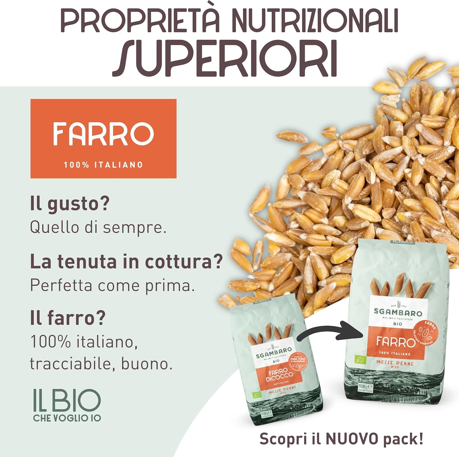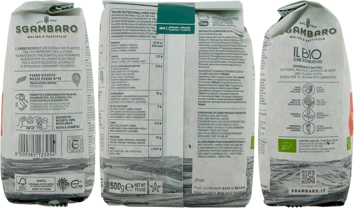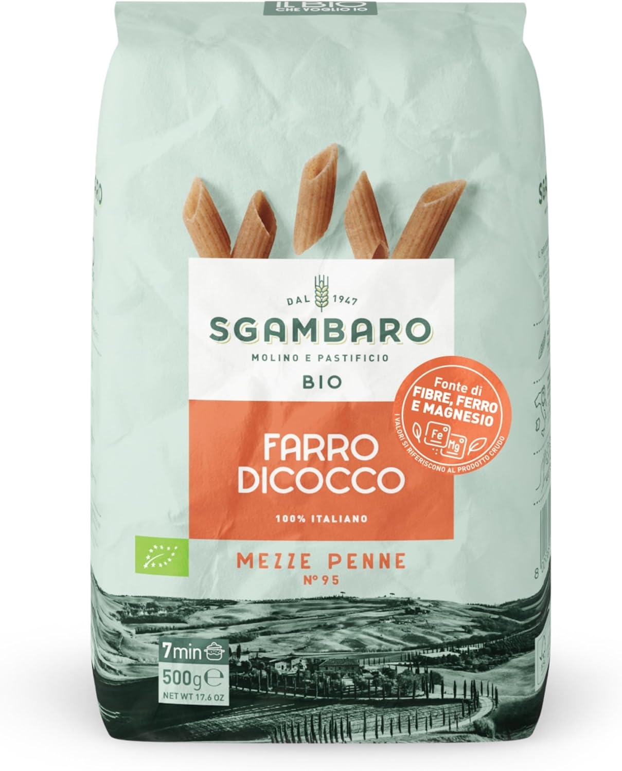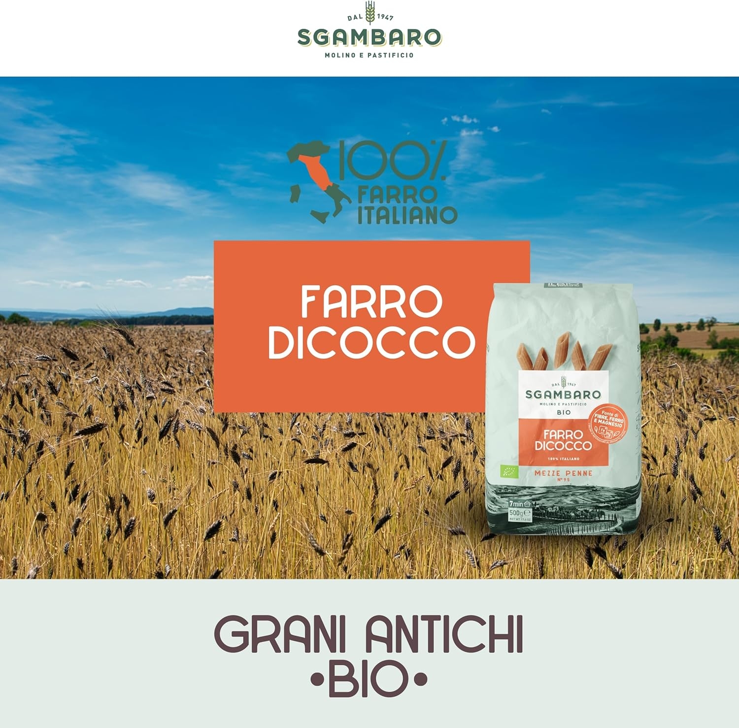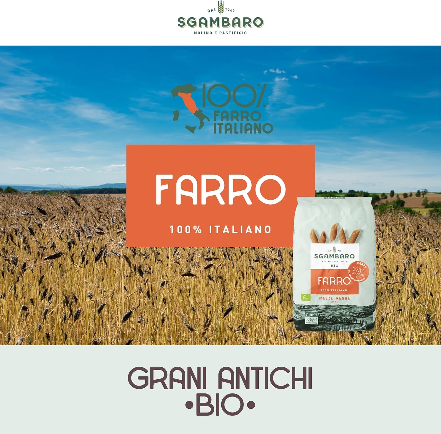 - 🍝 MEZZE PENNE RIGATE – 500 g di pasta preparata con Sfarinato (prodotto intermedio tra semola bianca e semola integrale) di Farro Biologico, La Selezione Sgambaro include solo farro 100% italiano, tracciabile e selezionato con criteri rigorosi.