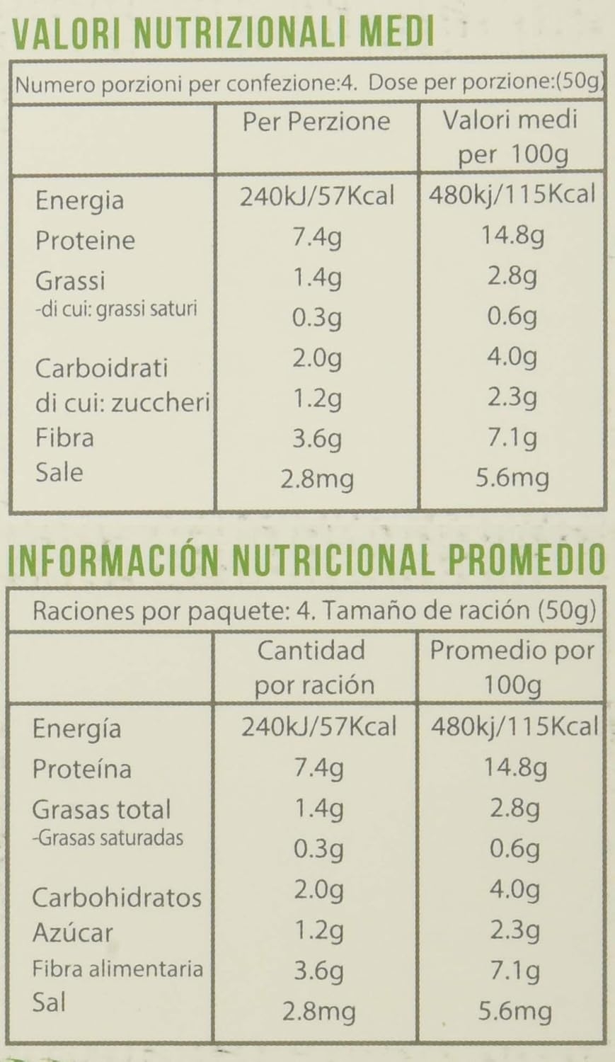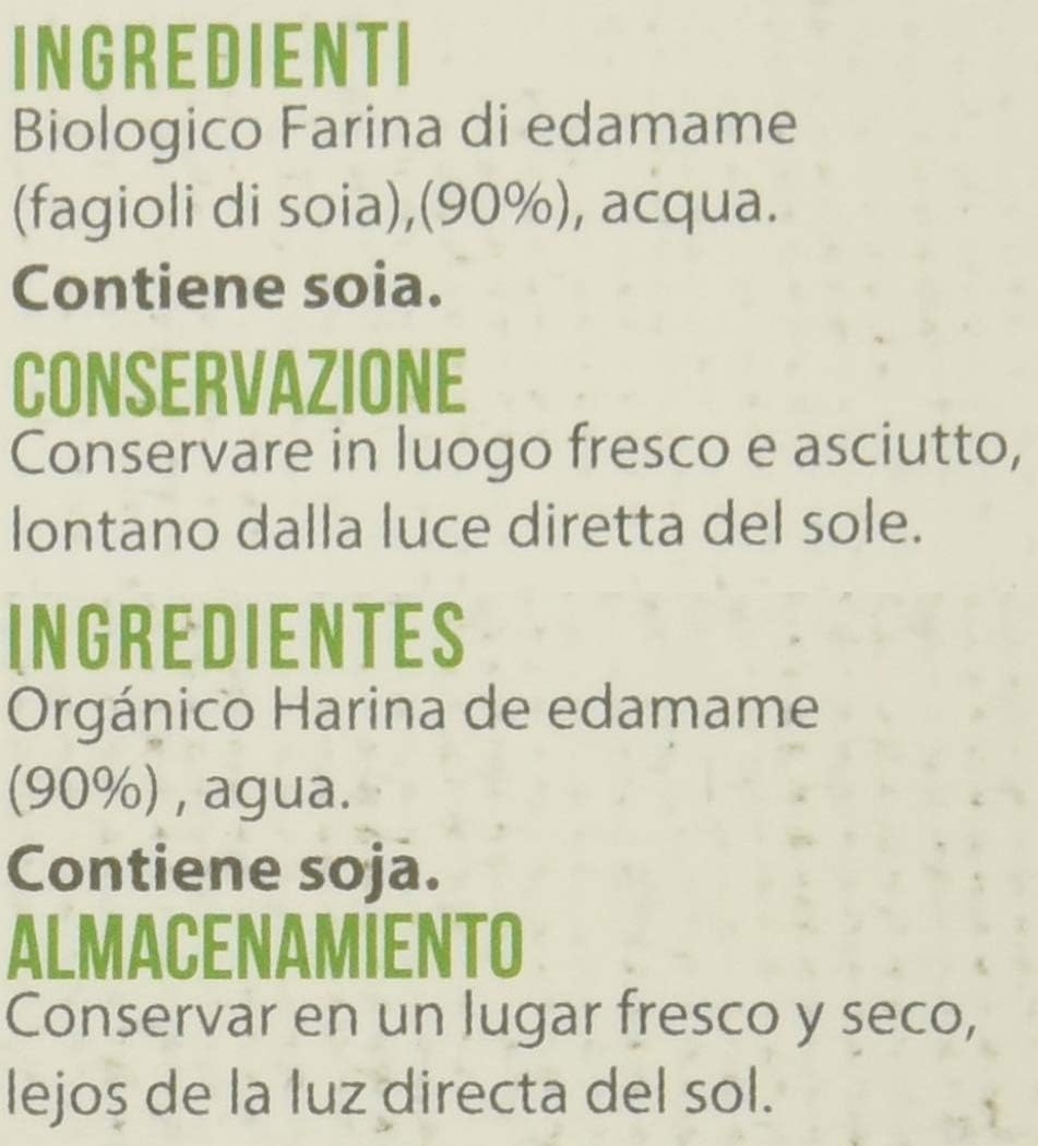 Farina bio di edamame (fagioli di soia) 90%, acqua. Contiene soia.