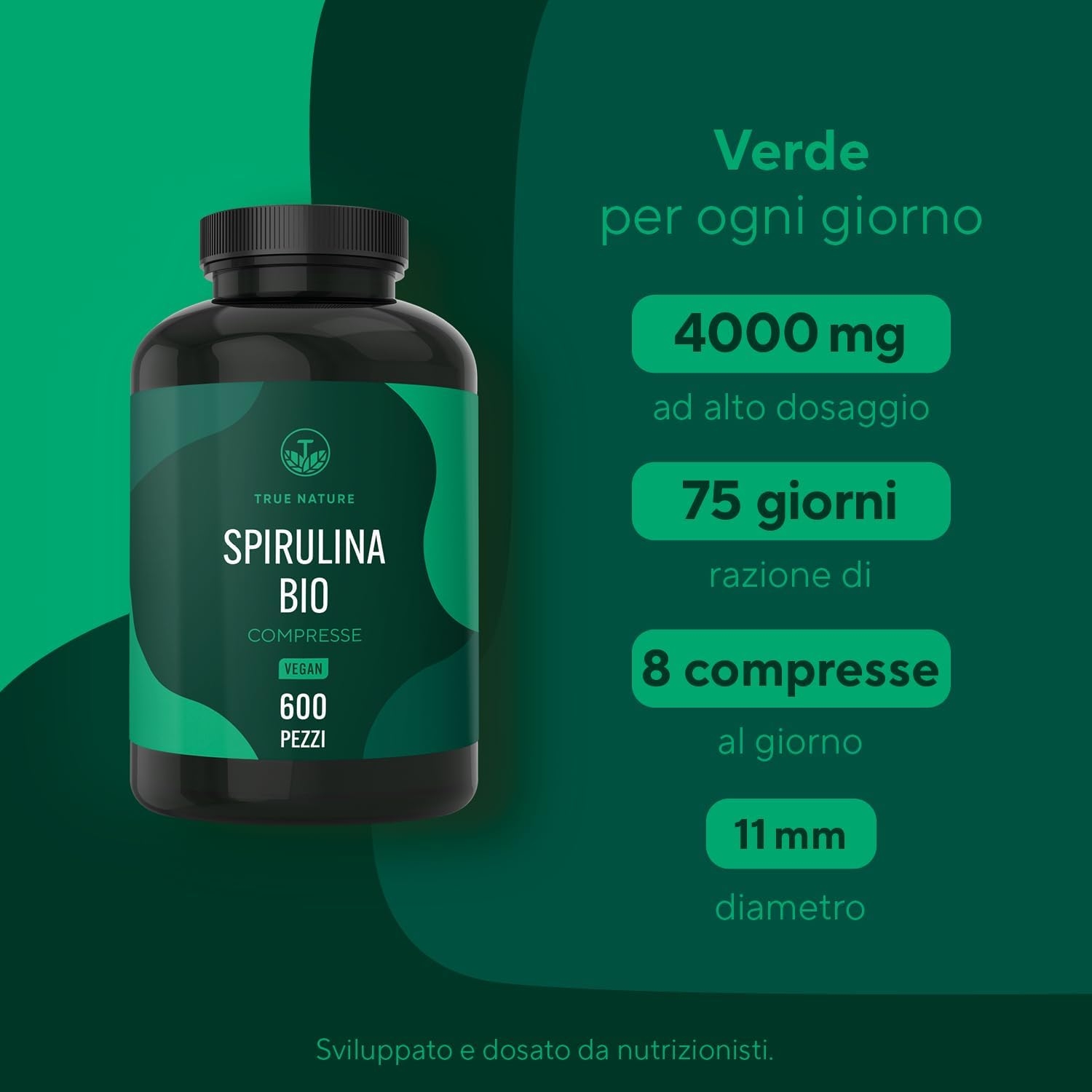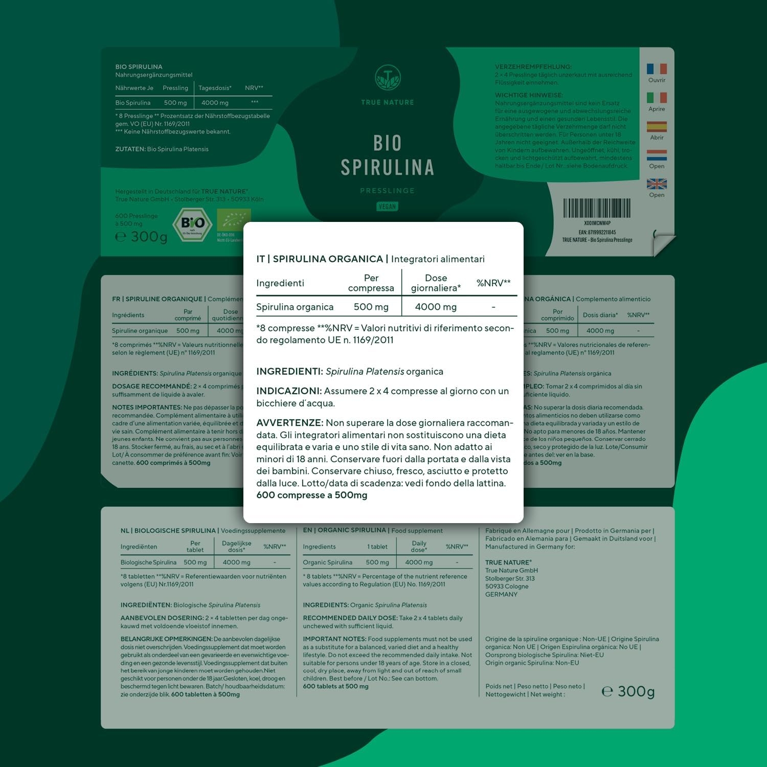 Spirulina Bio – 600 compresse 500 mg – Alto dosaggio – 4000 mg dose giornaliera – Ricca di ficocianina e proteine -Alga Spirulina pura – Analizzata in Italia e confezionata in Germania – TRUE NATURE