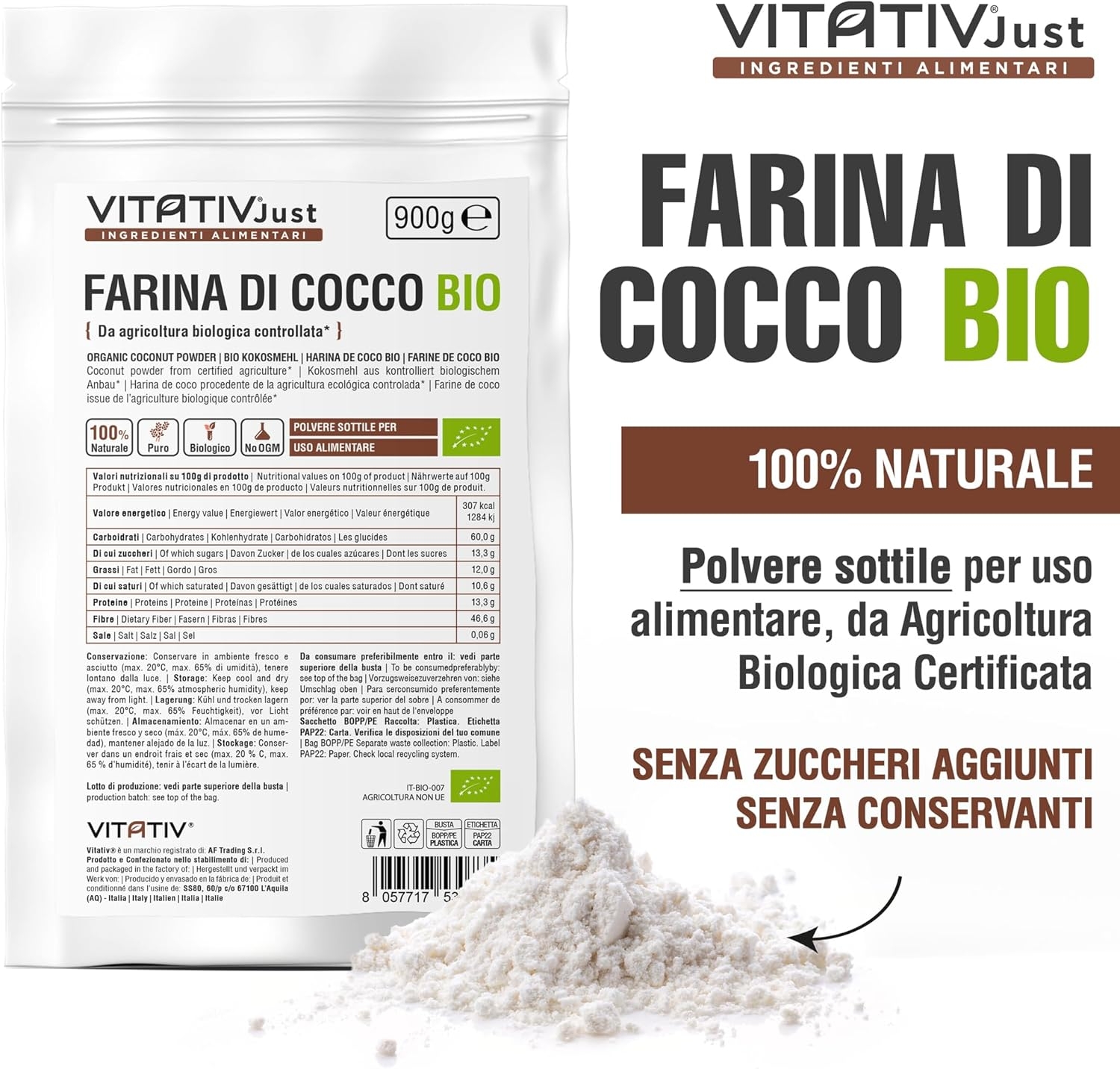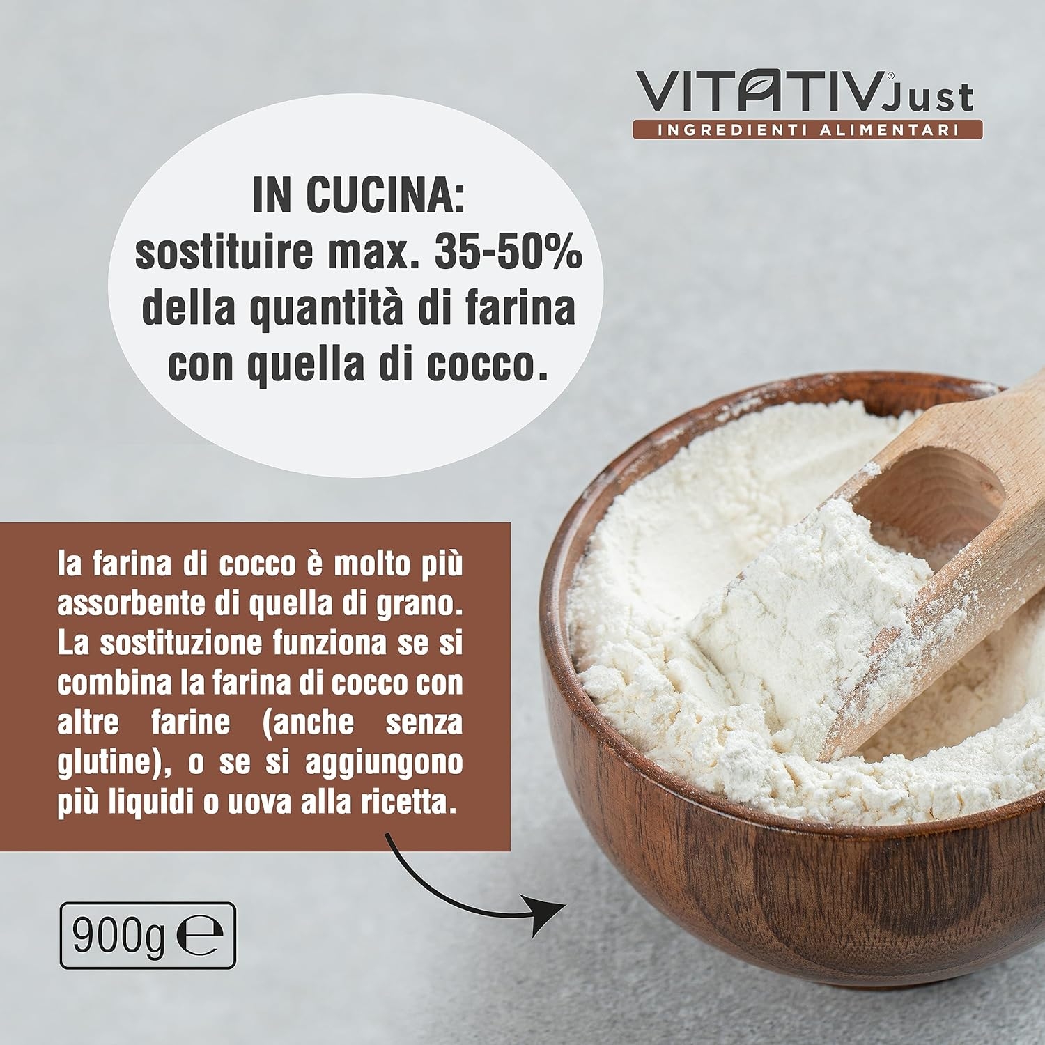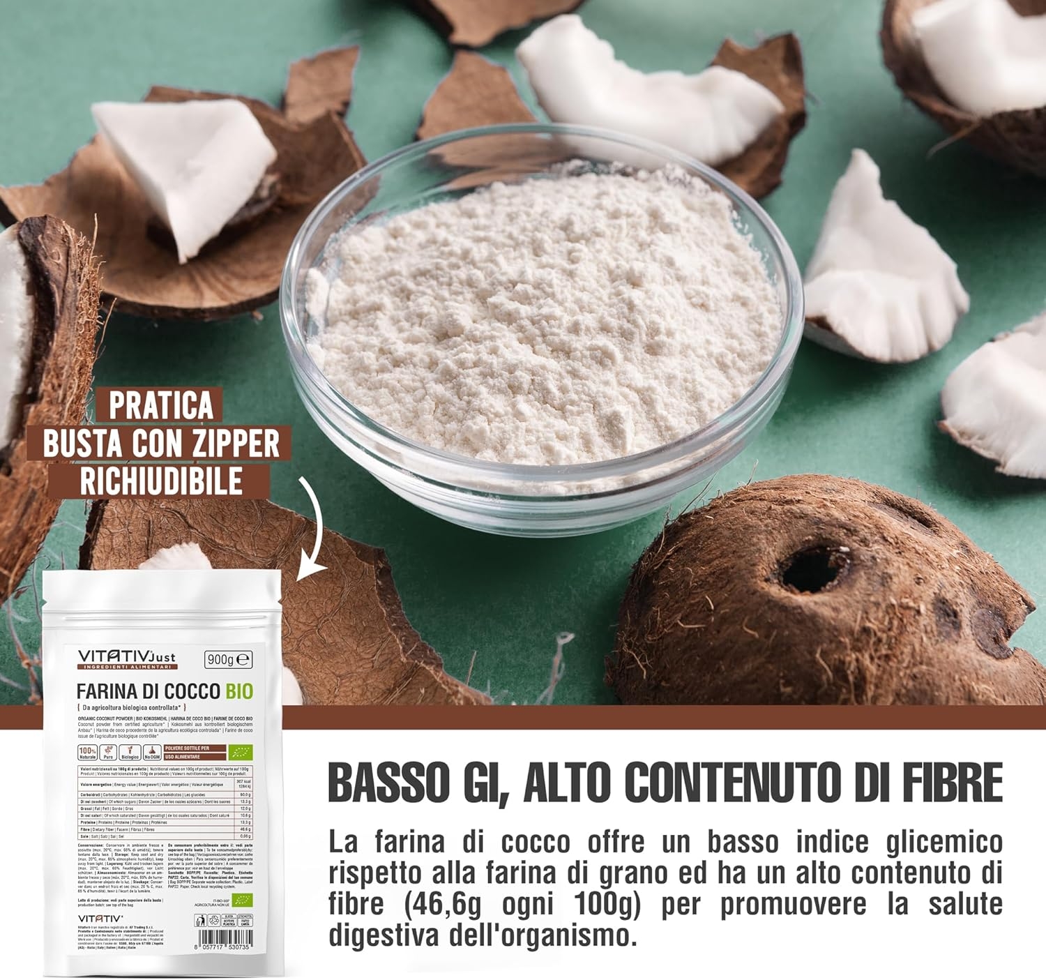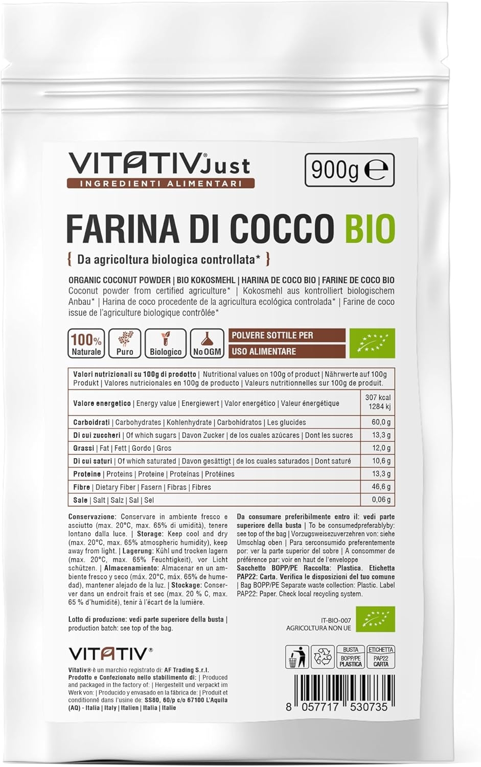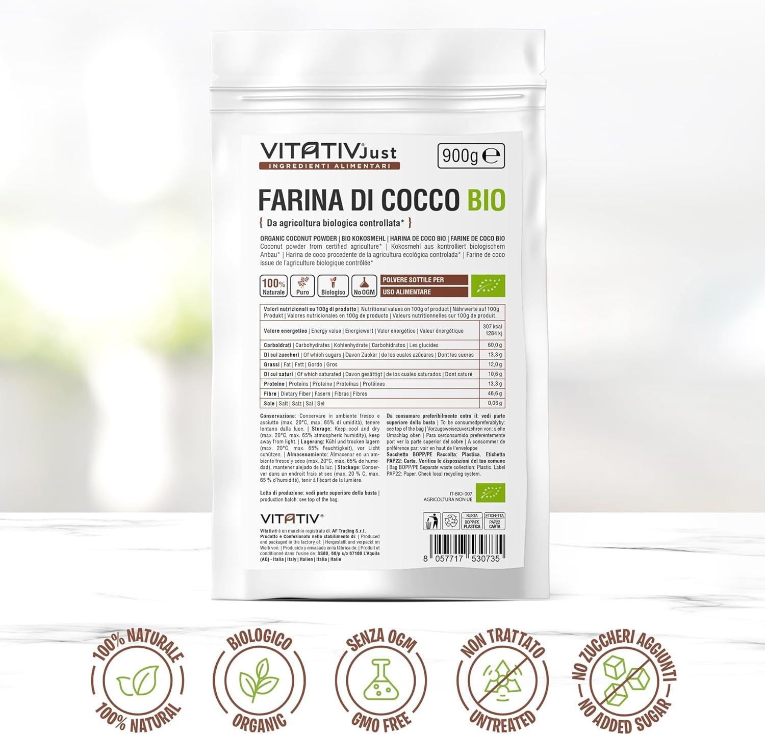 VITATIV – Farina di Cocco Bio 900g da Coltivazione Biologica Controllata – Ricca di Fibre e Sali Minerali, Senza Zuccheri Aggiunti